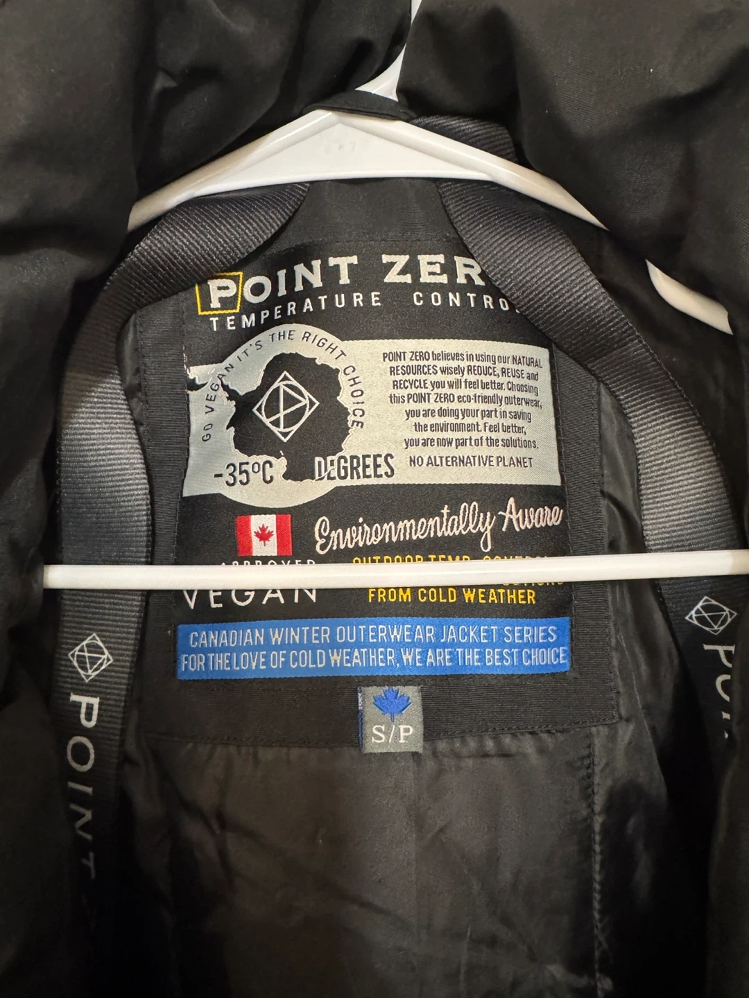 This Point Zero jacket is designed for cold weather. It's an environmentally aware, vegan outerwear piece. This bomber jacket is a Canadian winter series item. It's made for keeping warm during cold weather.