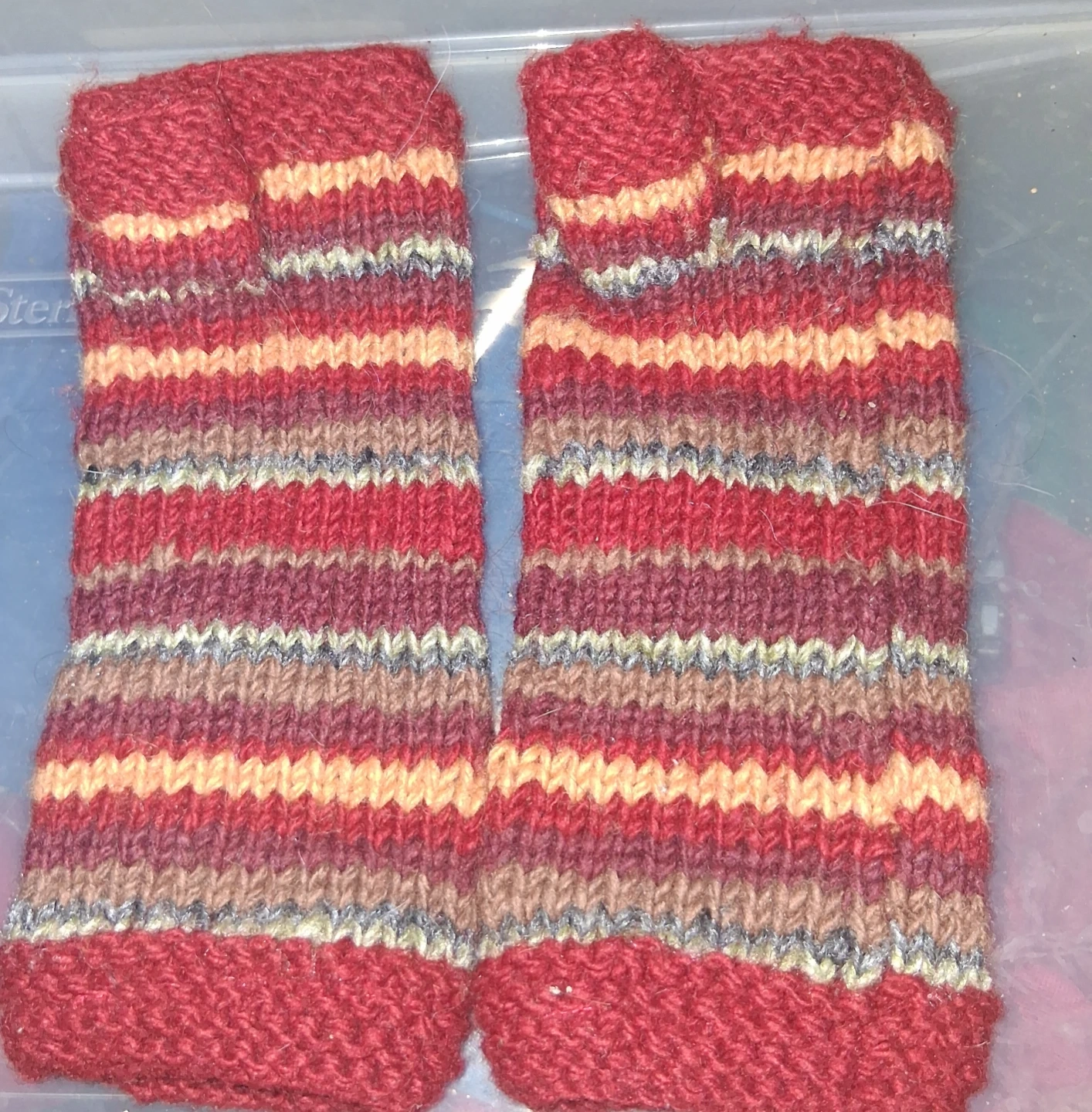 Cozy handknit fingerless gloves made from 100% wool with a 100% polyester lining. They were hand-knitted in Nepal. Ideal for keeping your hands warm while maintaining dexterity! + Small gloves. Pick up only unless near the intersection of Oxford and Gammage Street.