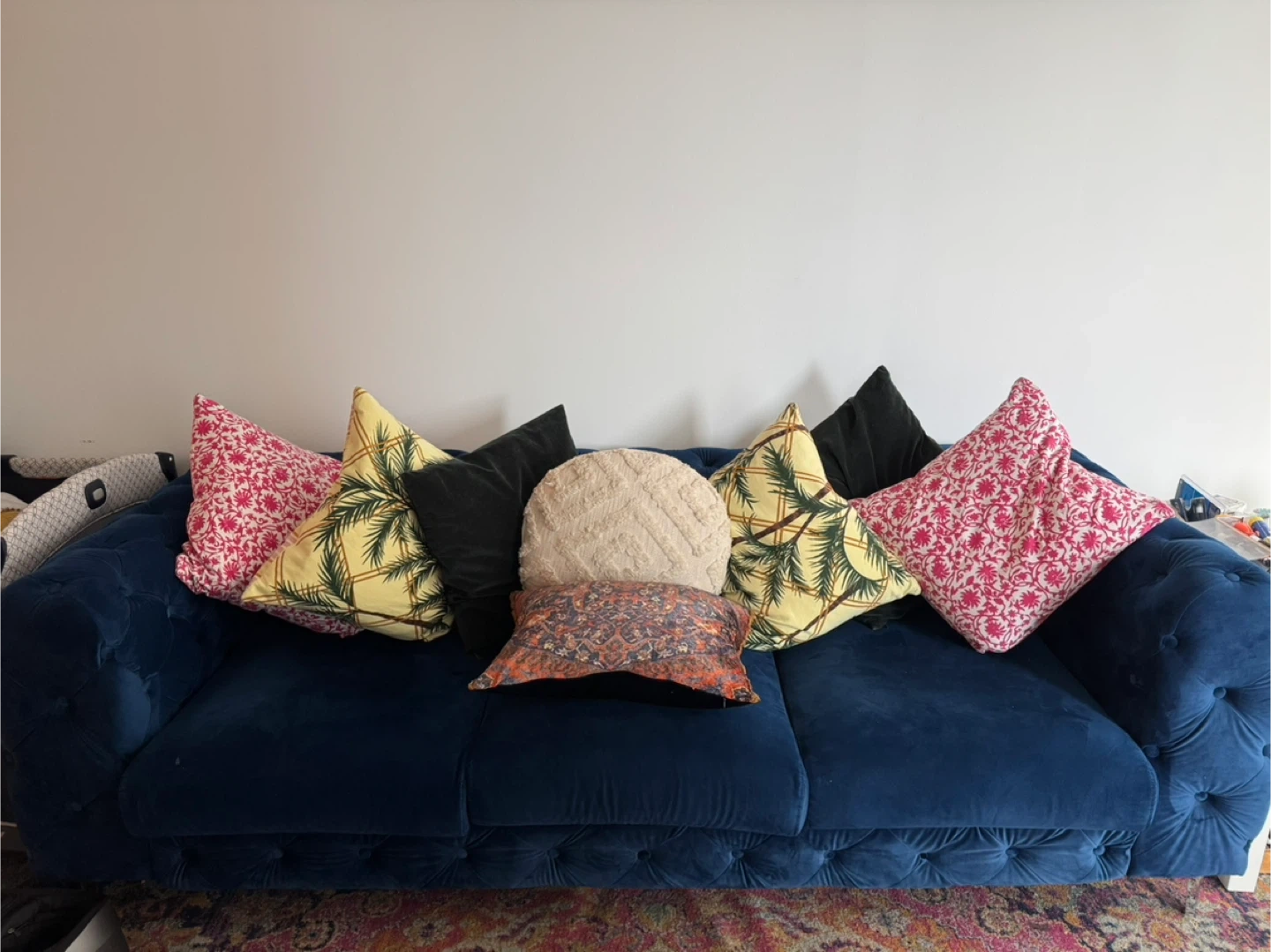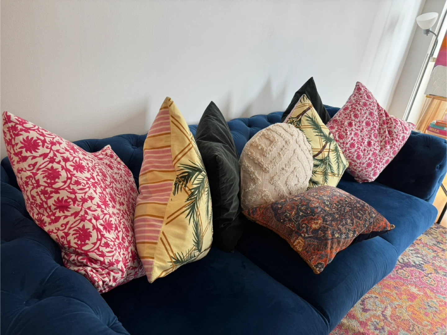 A collection of 8 decorative throw pillows for your couch or sofa. Includes pillows with pink floral print, yellow palm leaf design, textured cream, and a patterned ethnic print. Adds a pop of colour and comfort to any seating area!