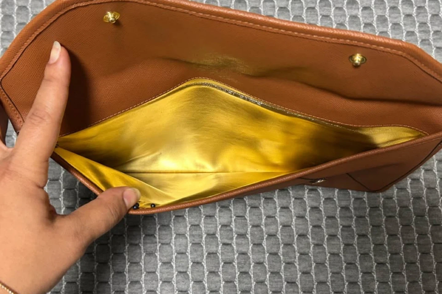 Made from durable Saffiano leather with gold-tone hardware and a sleek envelope design.