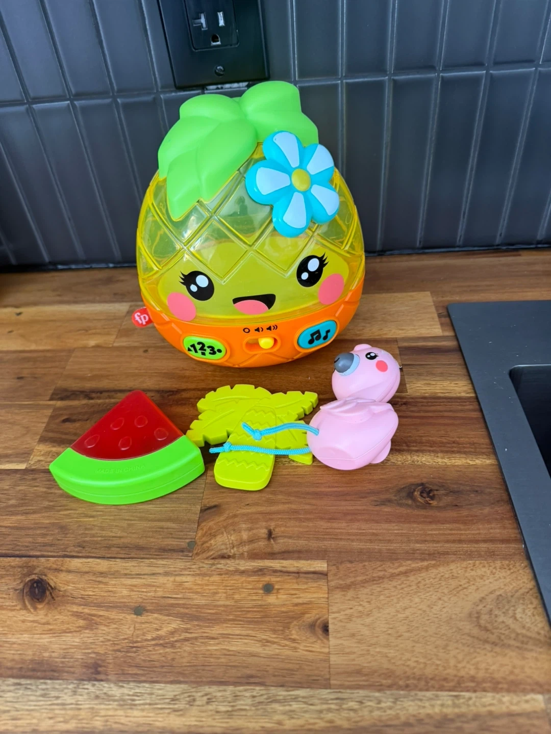 Fisher-Price Laugh & Learn pineapple toy with lights and sounds. It includes three fun shapes: a watermelon slice, a leaf, and a pink bird. The toy lights up and plays music, engaging little ones with interactive play.