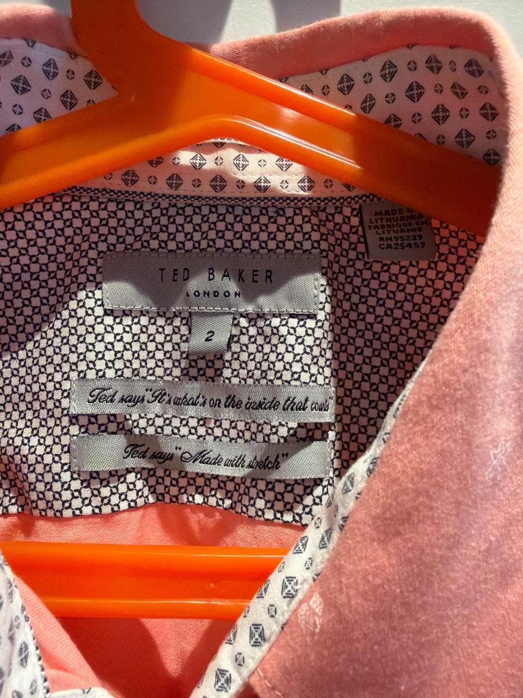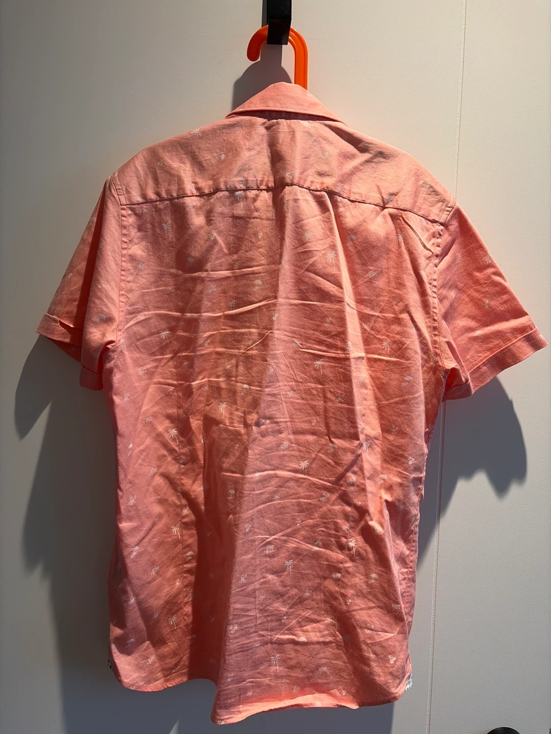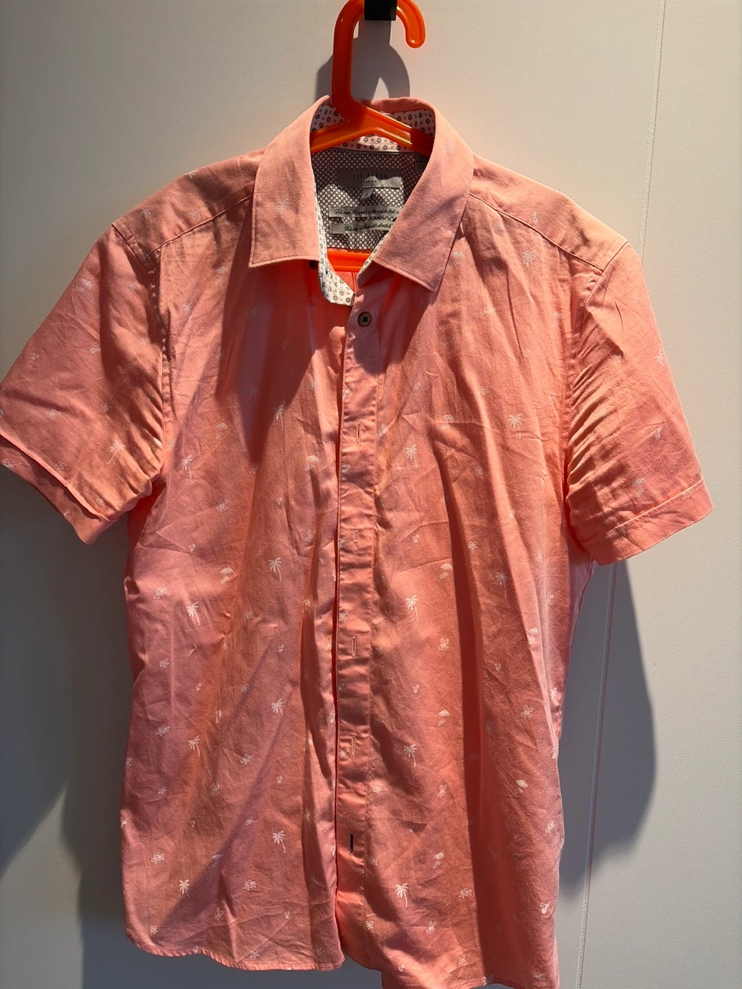 Coral pink short sleeve button-up shirt from Ted Baker London. Features a subtle palm tree pattern all over. Made with stretch fabric for comfort. Size men US 2.