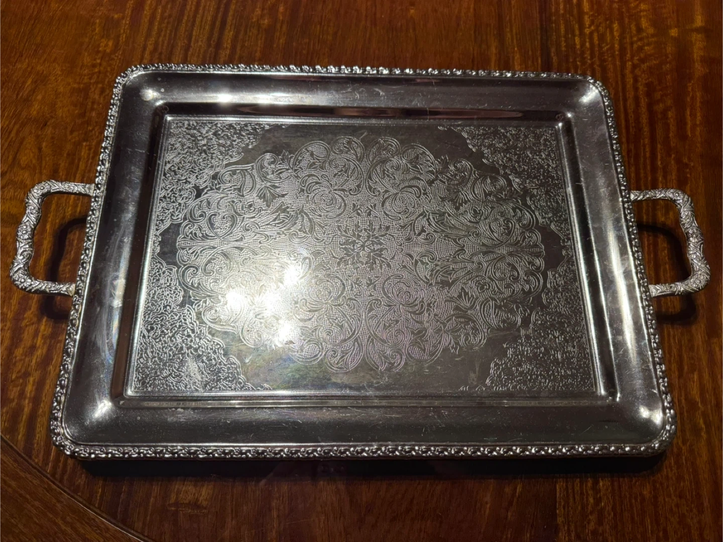 Decorative silver-plated serving tray with ornate handles and embossed scrollwork. It's perfect for serving drinks or appetizers at gatherings. This tray is silver-plated.