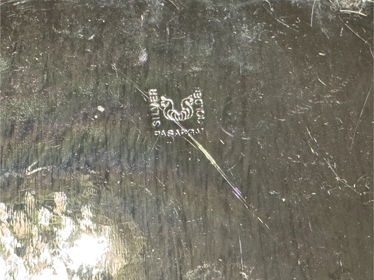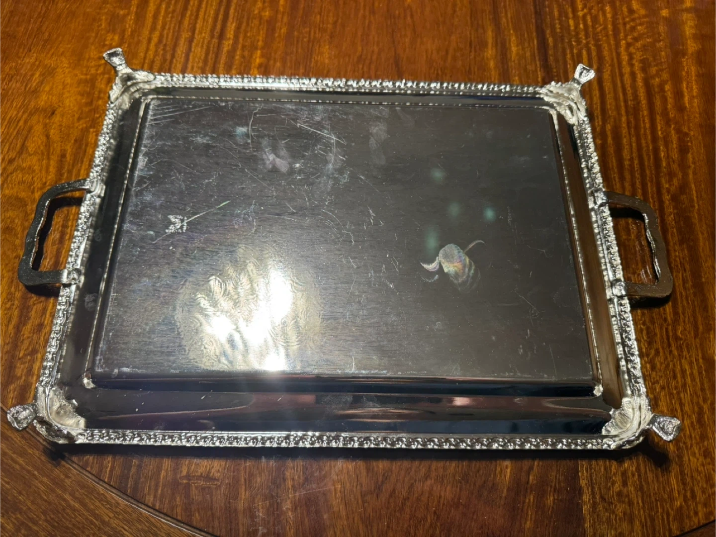 Decorative silver-plated serving tray with ornate handles and embossed scrollwork. It's perfect for serving drinks or appetizers at gatherings. This tray is silver-plated.