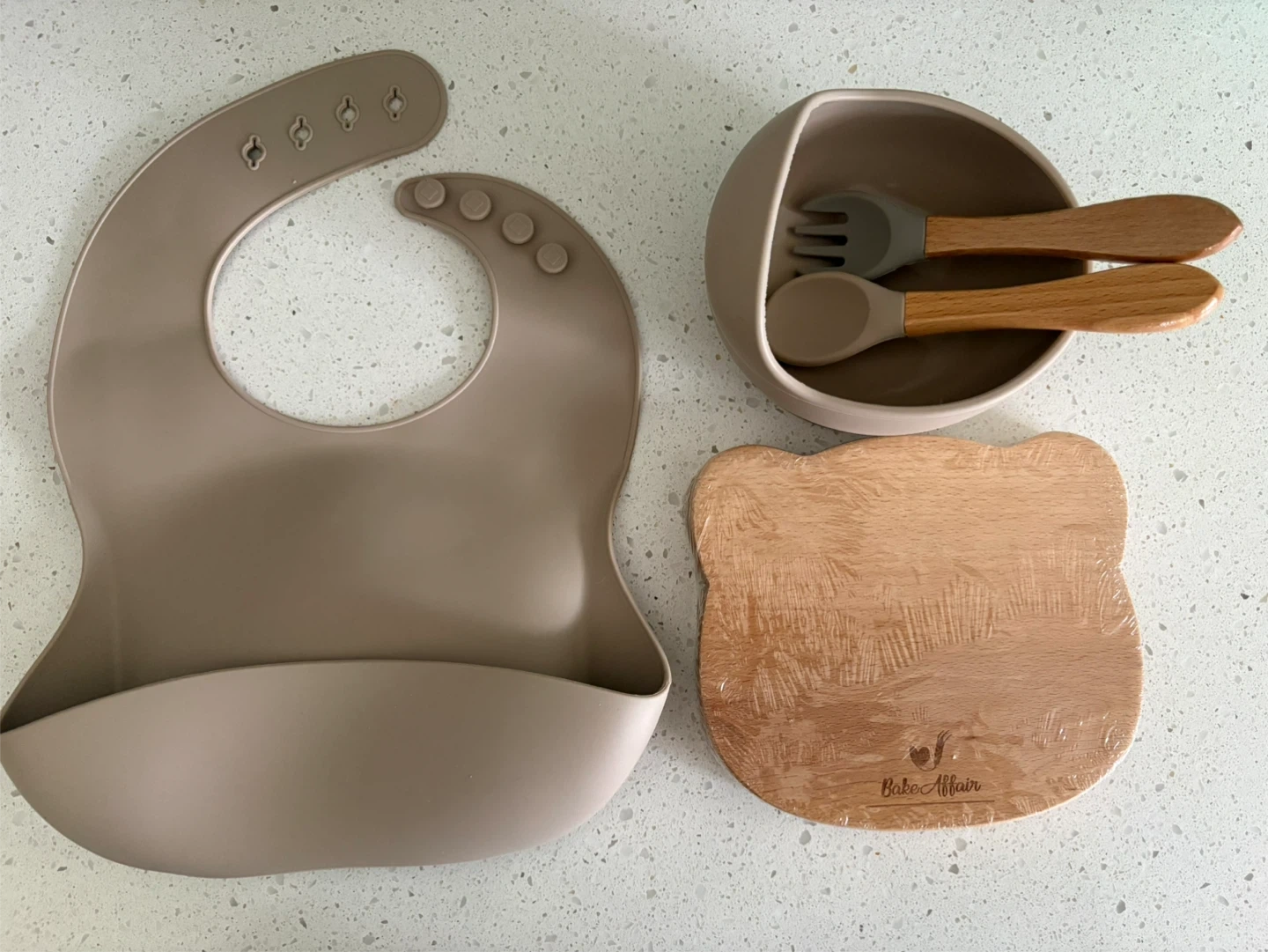 Never used baby solid food starter set! Have 2 more that are same and very good for a newborn starting on solids. It has a bowl 🥣 🥄 spoon 🍴 fork , bib and a wooden plate still wrapped in plastic as it is new.