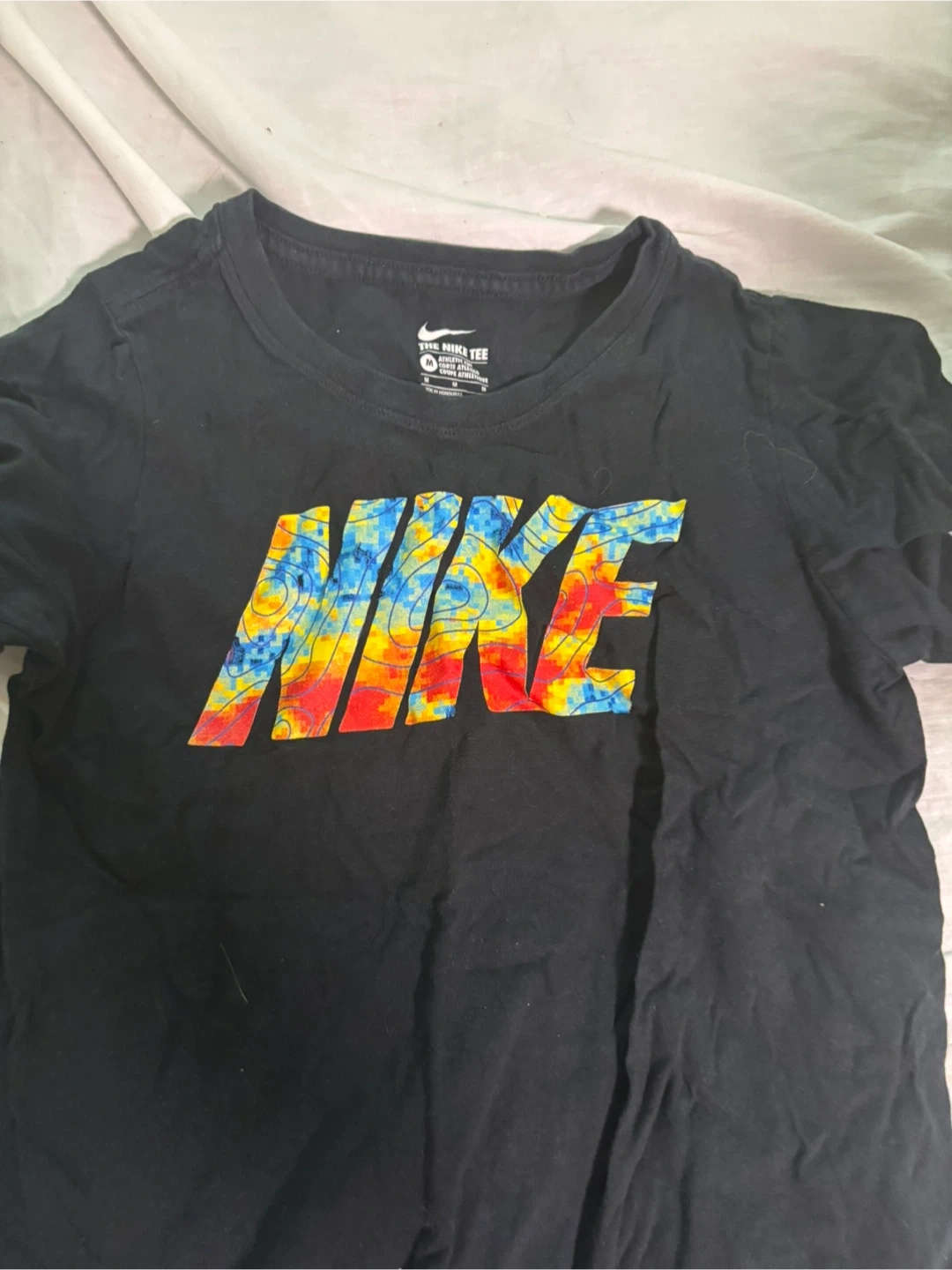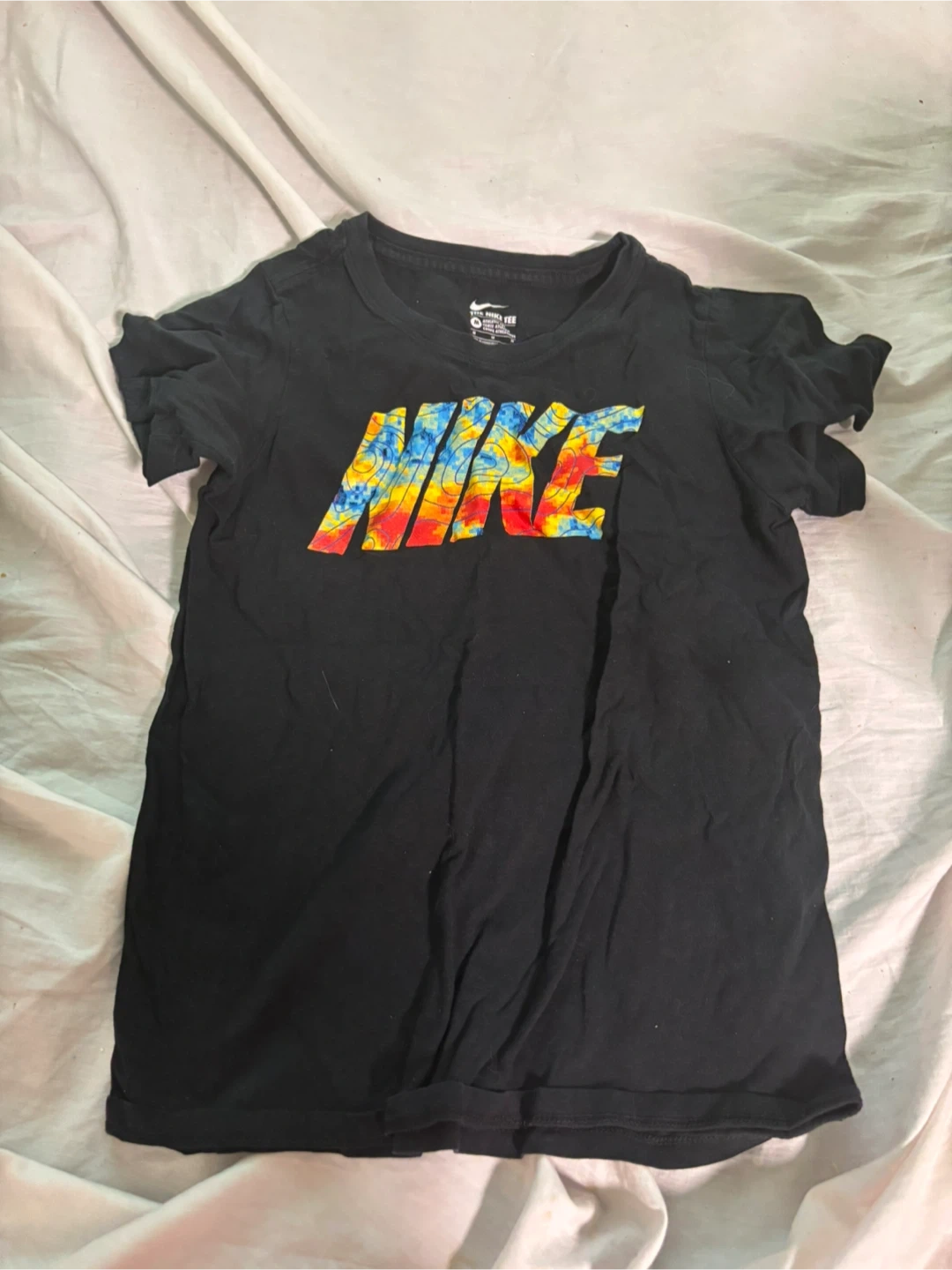 Selling a Nike black T-shirt with a colourful Nike logo. It's a size M and in good condition. Perfect for casual wear!