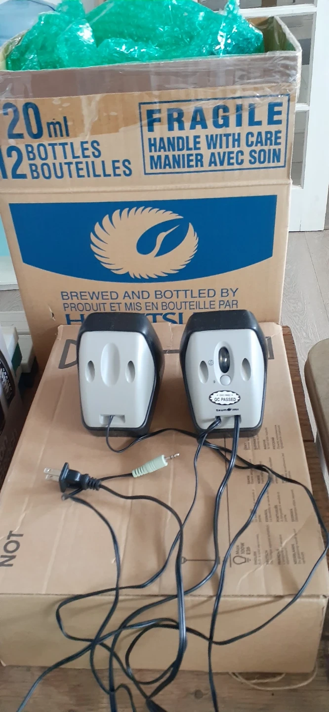 Compact computer speakers from Logitech. They plug into a standard audio jack and a wall outlet for power. Great for boosting your computer's audio output!