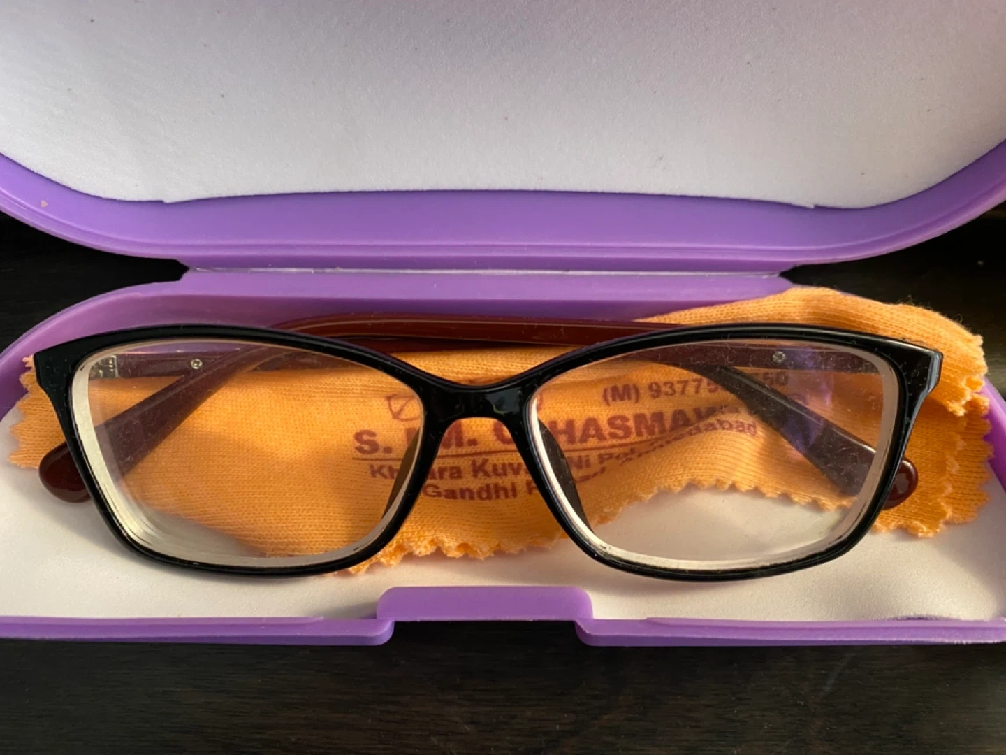 Comes with two pairs of eyeglasses, one purple and one black. Each pair includes a hard carrying case and a cleaning cloth. Eyeglasses are in good condition.