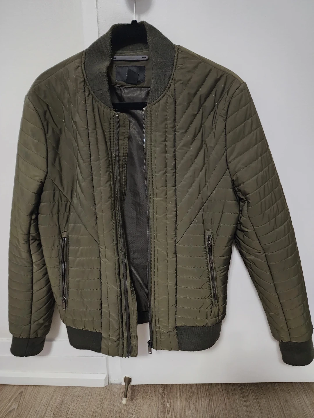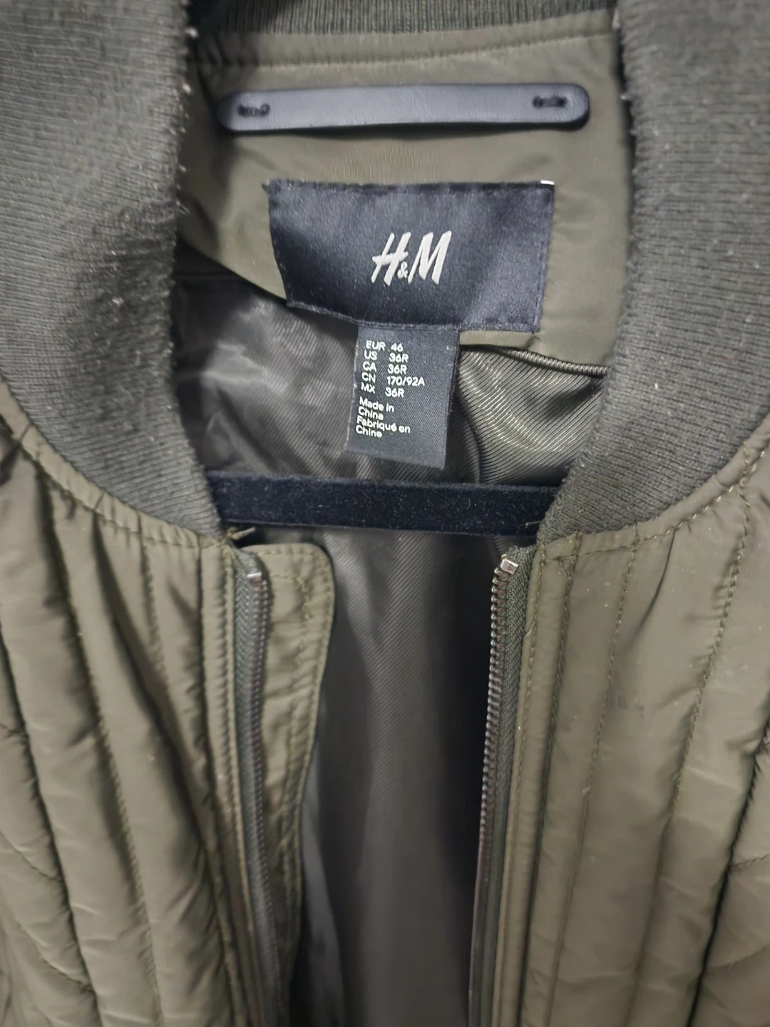Selling an H&M bomber jacket in olive green. It's a quilted style and in great condition! Size is 36R.
