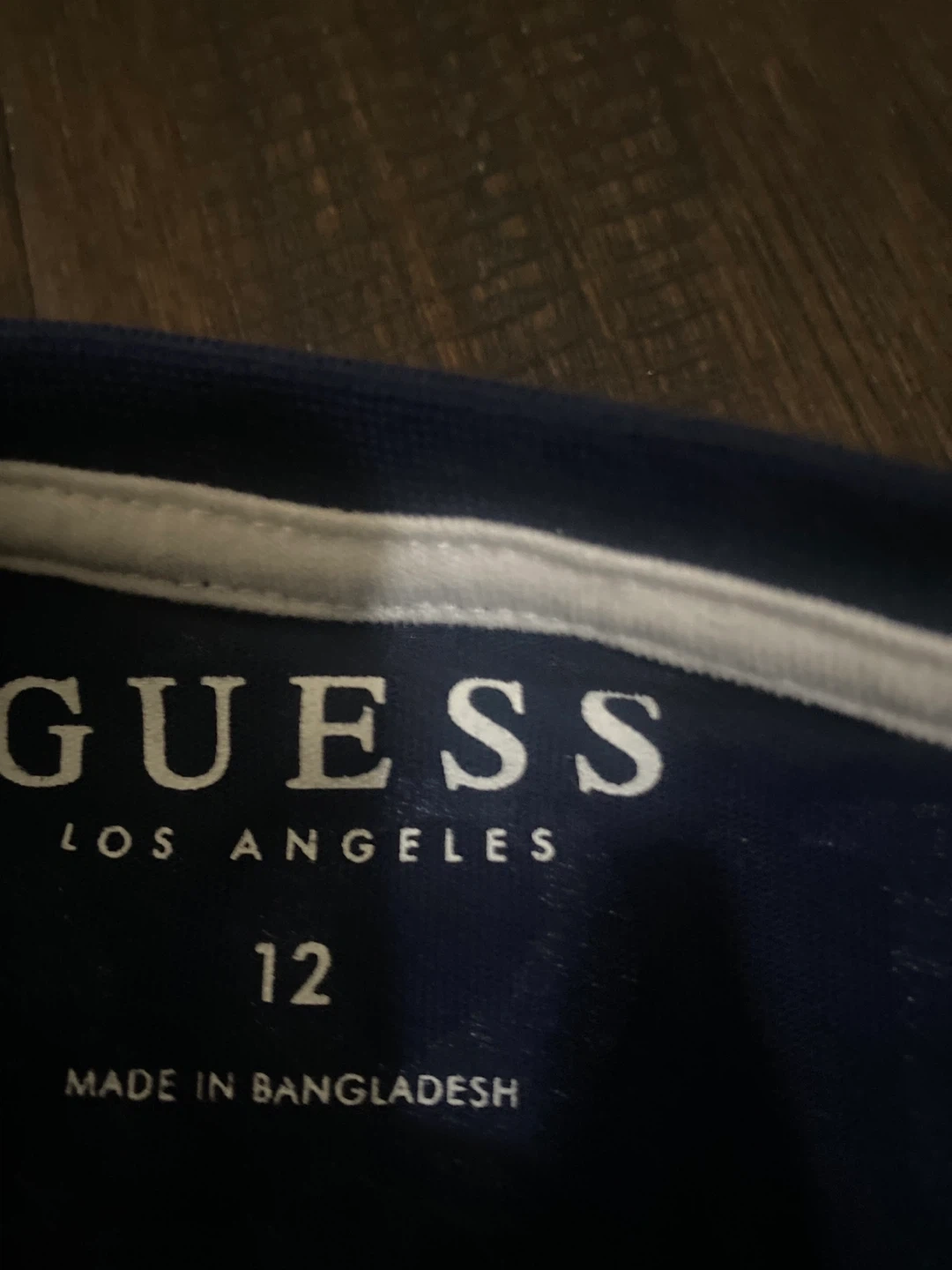 This Guess Kids long-sleeved shirt is a size 12. It features a navy body with a repeating Guess logo and text pattern, and white sleeves. Made in Bangladesh. Boys