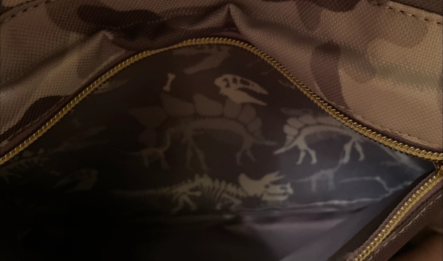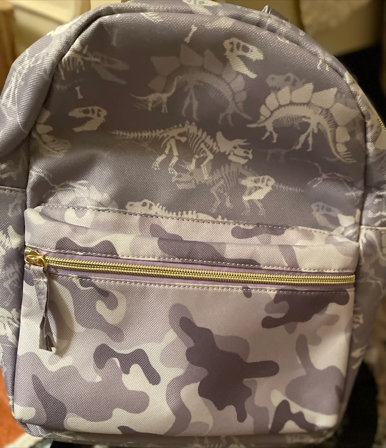 New grey backpack with dinosaur camo pattern. It also has couple of pockets inside,out. Perfect for kids, school.