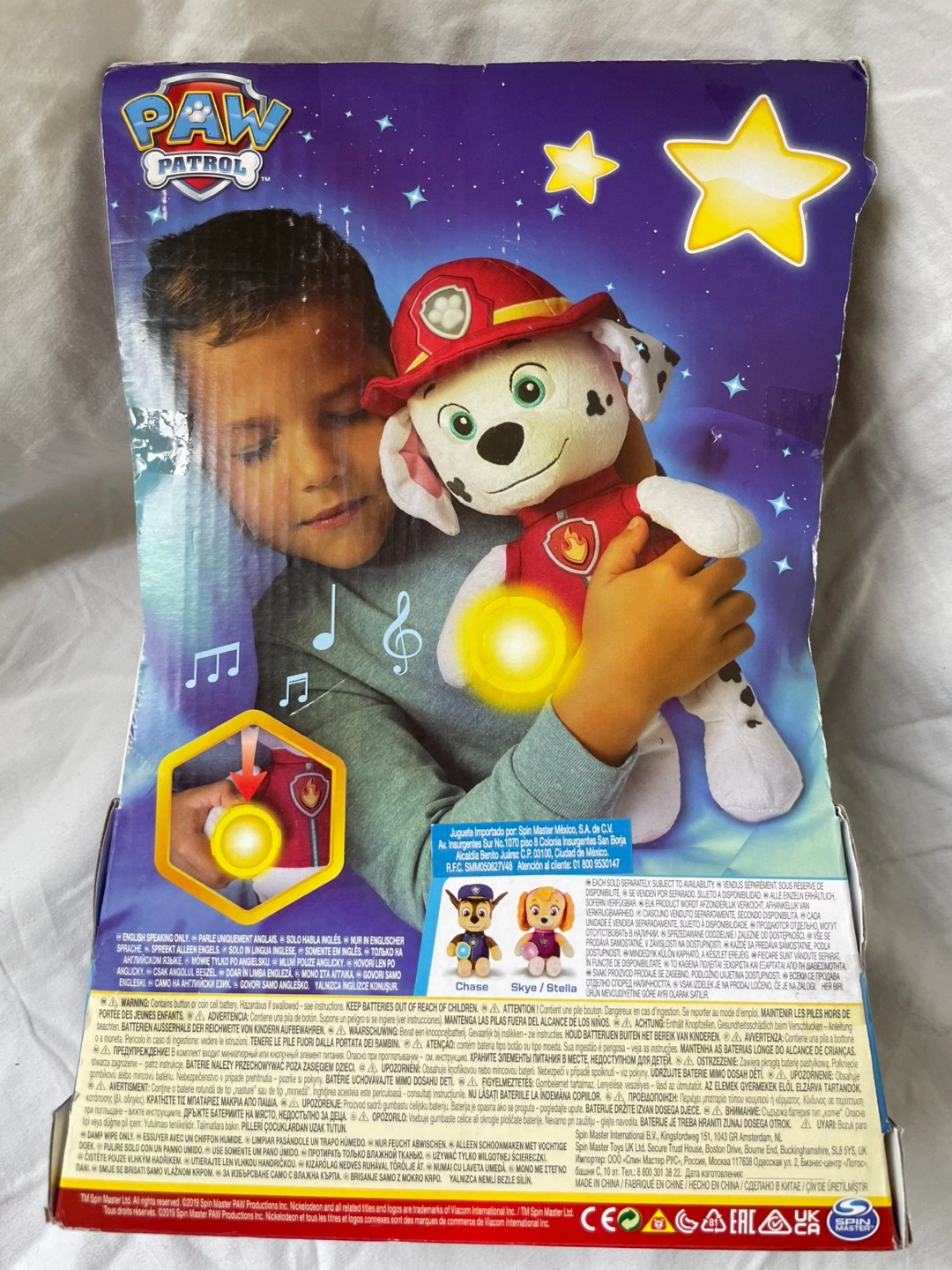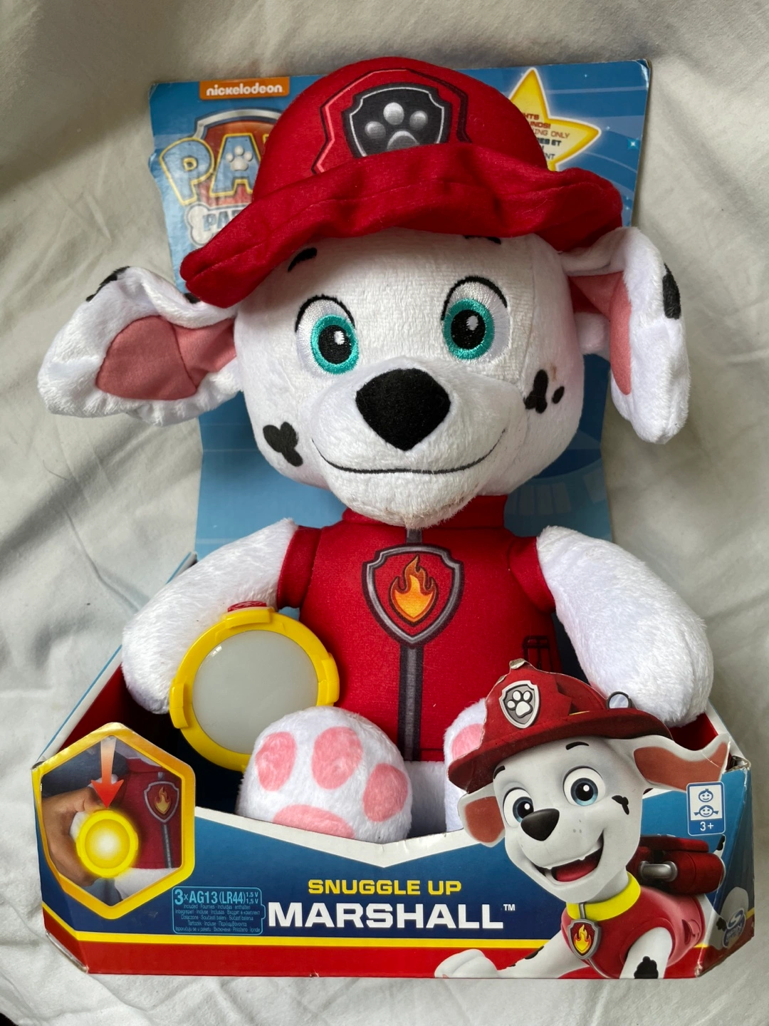 Selling a brand new Paw Patrol Snuggle Up Marshall plush! It's still in its original packaging and ready for a new home. This cuddly Marshall is perfect for bedtime snuggles and includes a light-up badge to help kids feel safe and secure at night