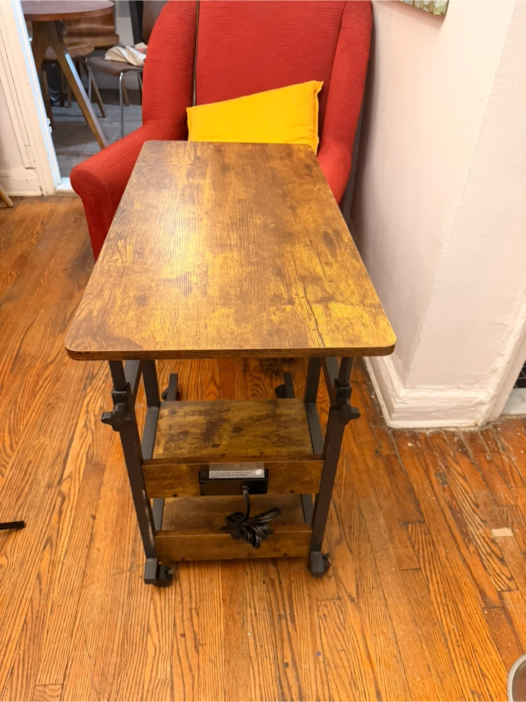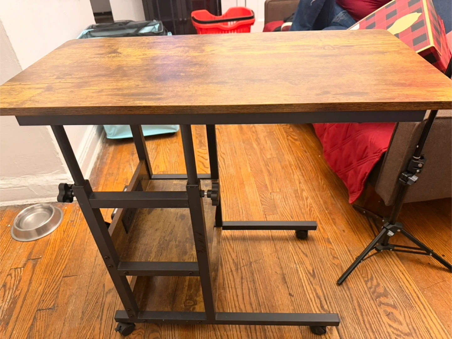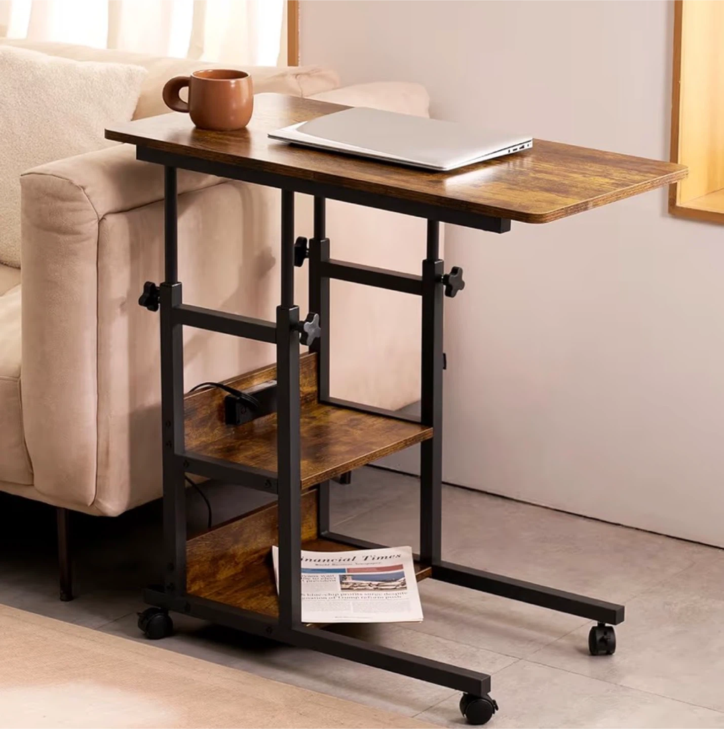 This rolling laptop table features a rustic wood-grain finish and a sturdy metal frame. Its height and tabletop angle are adjustable, and it includes two lower shelves for storage. The casters make it easy to move around!
