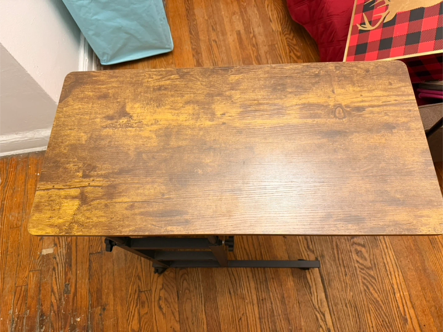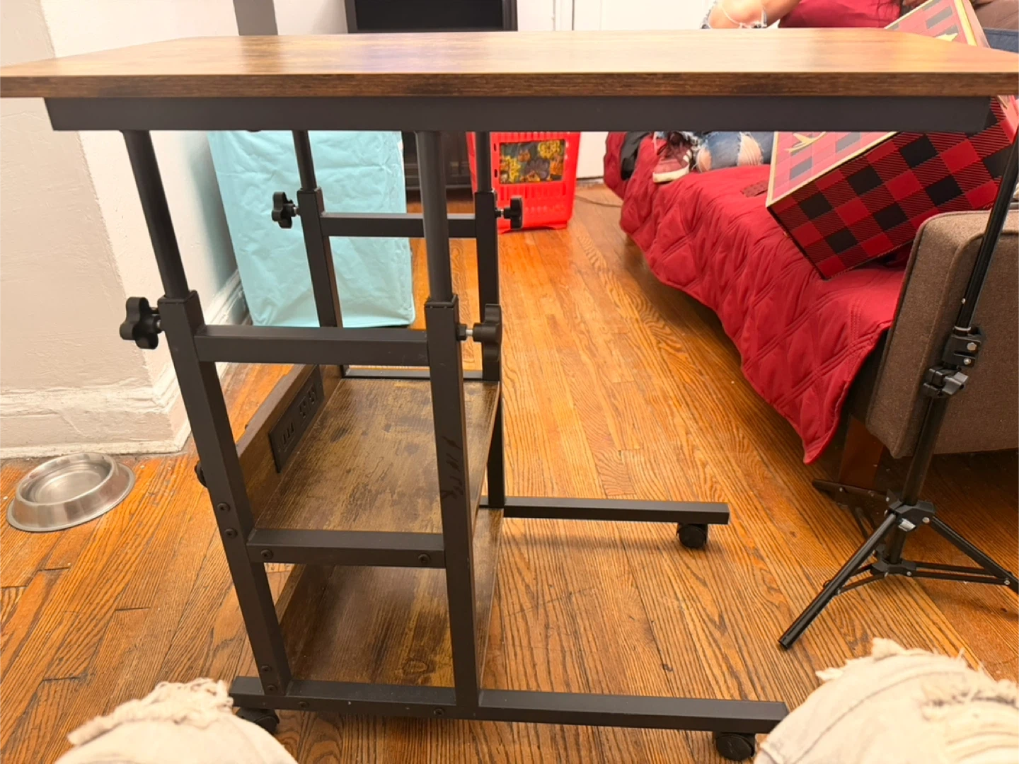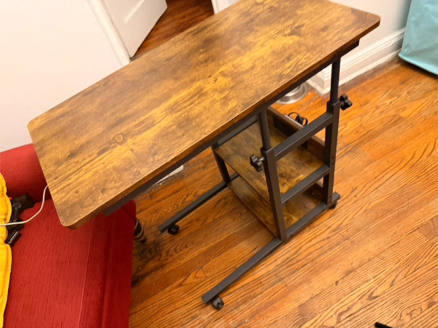 This rolling laptop table features a rustic wood-grain finish and a sturdy metal frame. Its height and tabletop angle are adjustable, and it includes two lower shelves for storage. The casters make it easy to move around!