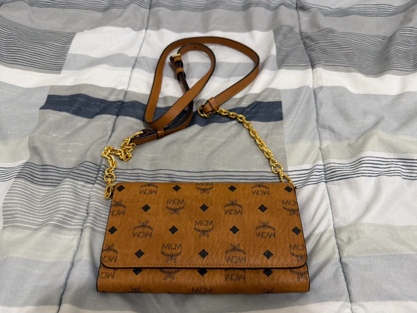 This MCM wallet on chain is a classic brown monogram design. It features multiple card slots and a zippered pocket inside. The chain strap is detachable.