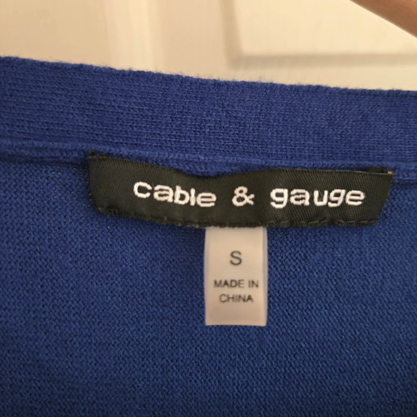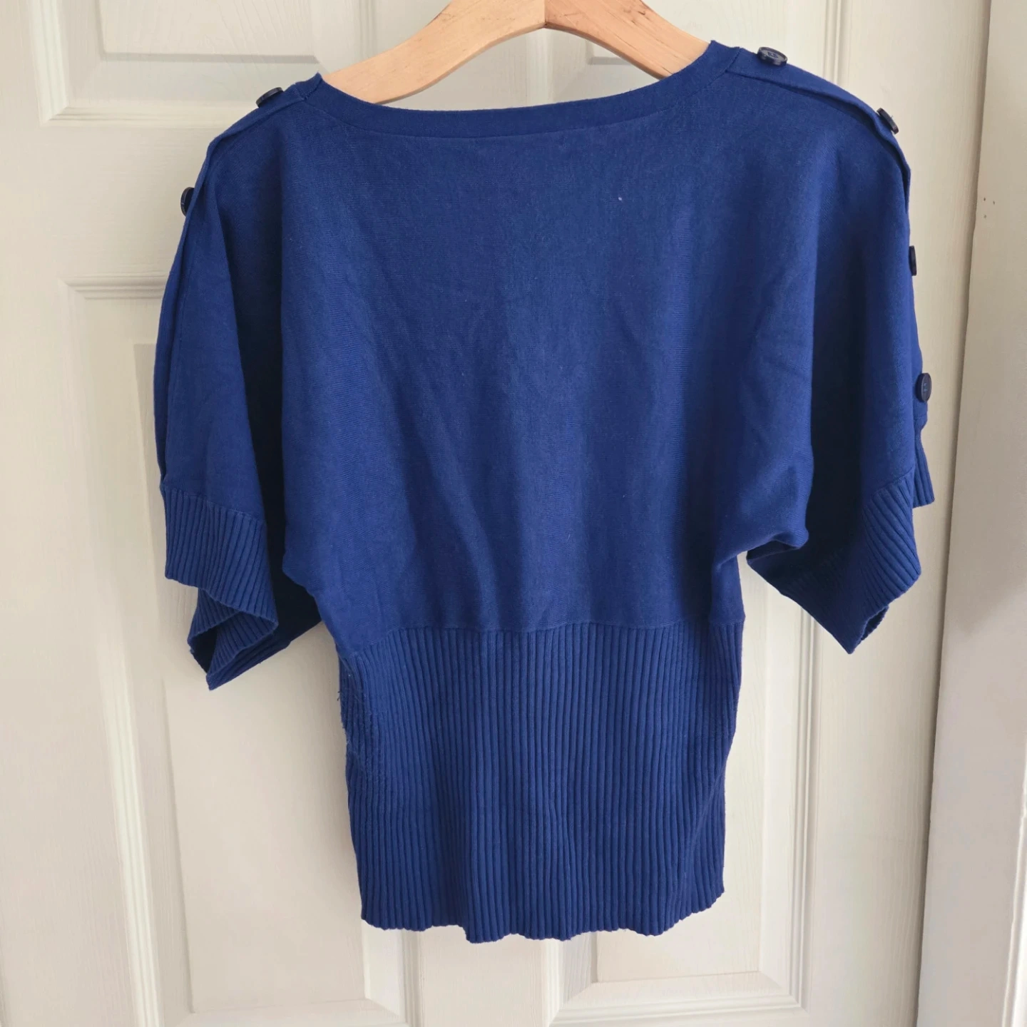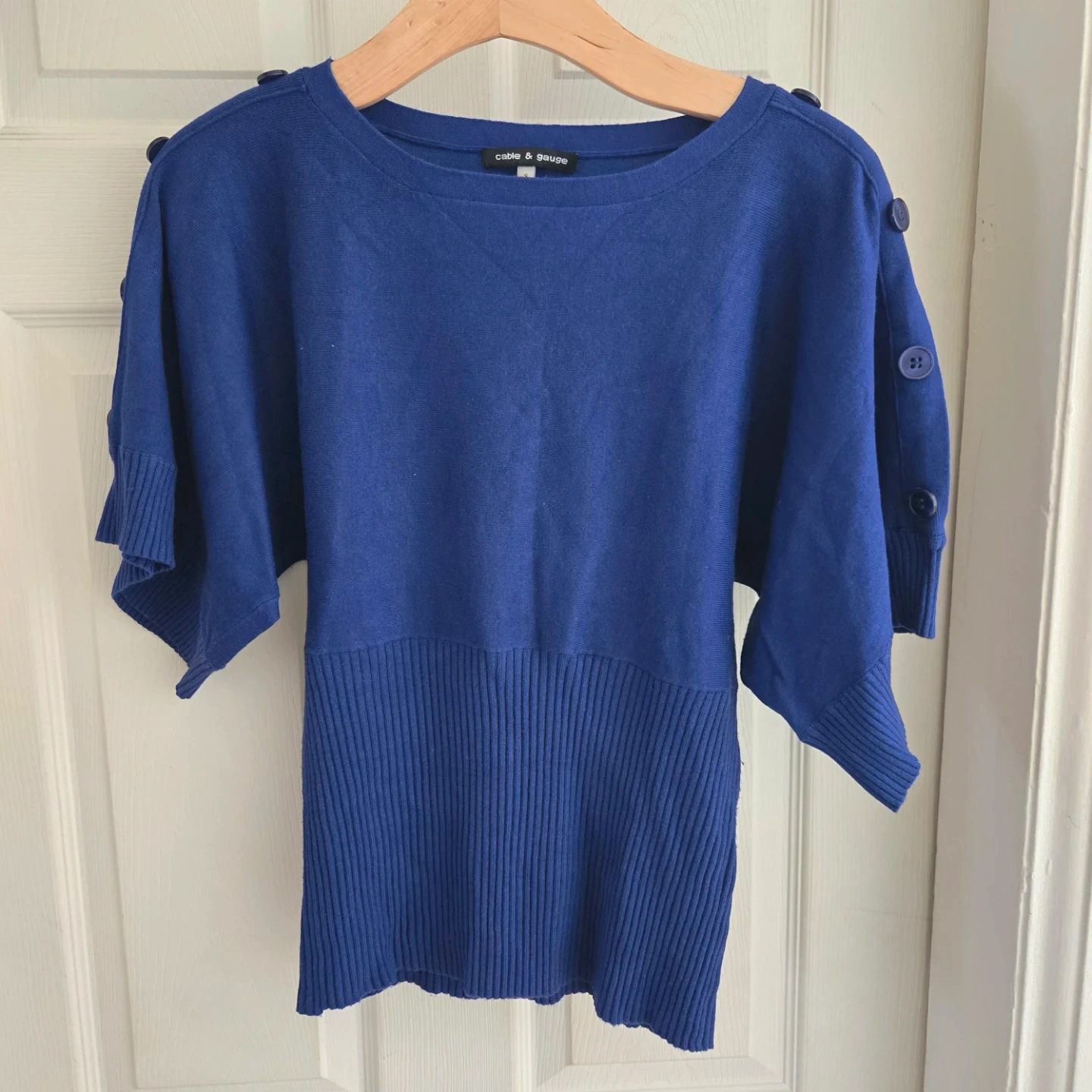 This is a blue Cable & Gauge sweater in size small. It features decorative buttons on the sleeves. Ribbed hem detail.