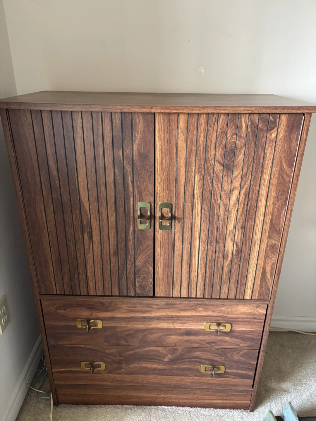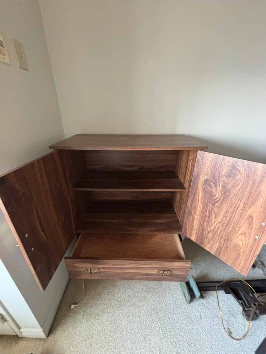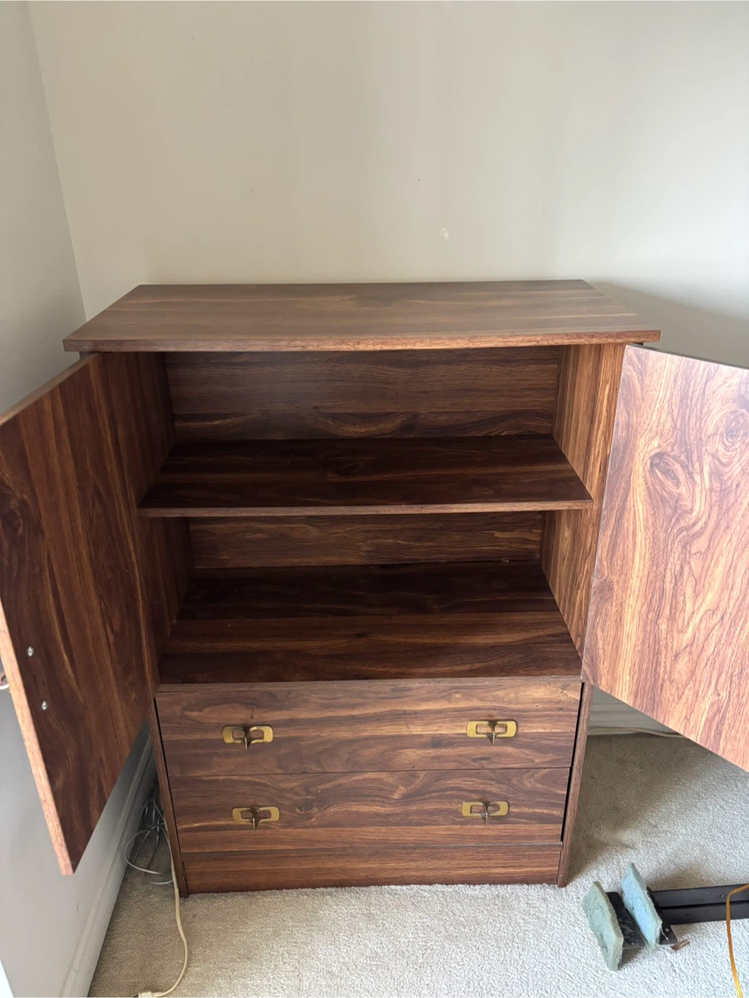 A nice wooden cabinet with two doors and two drawers. Inside there are two shelves and one drawer.