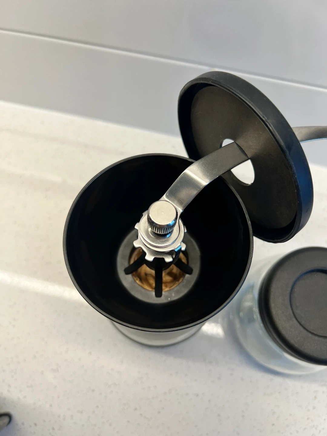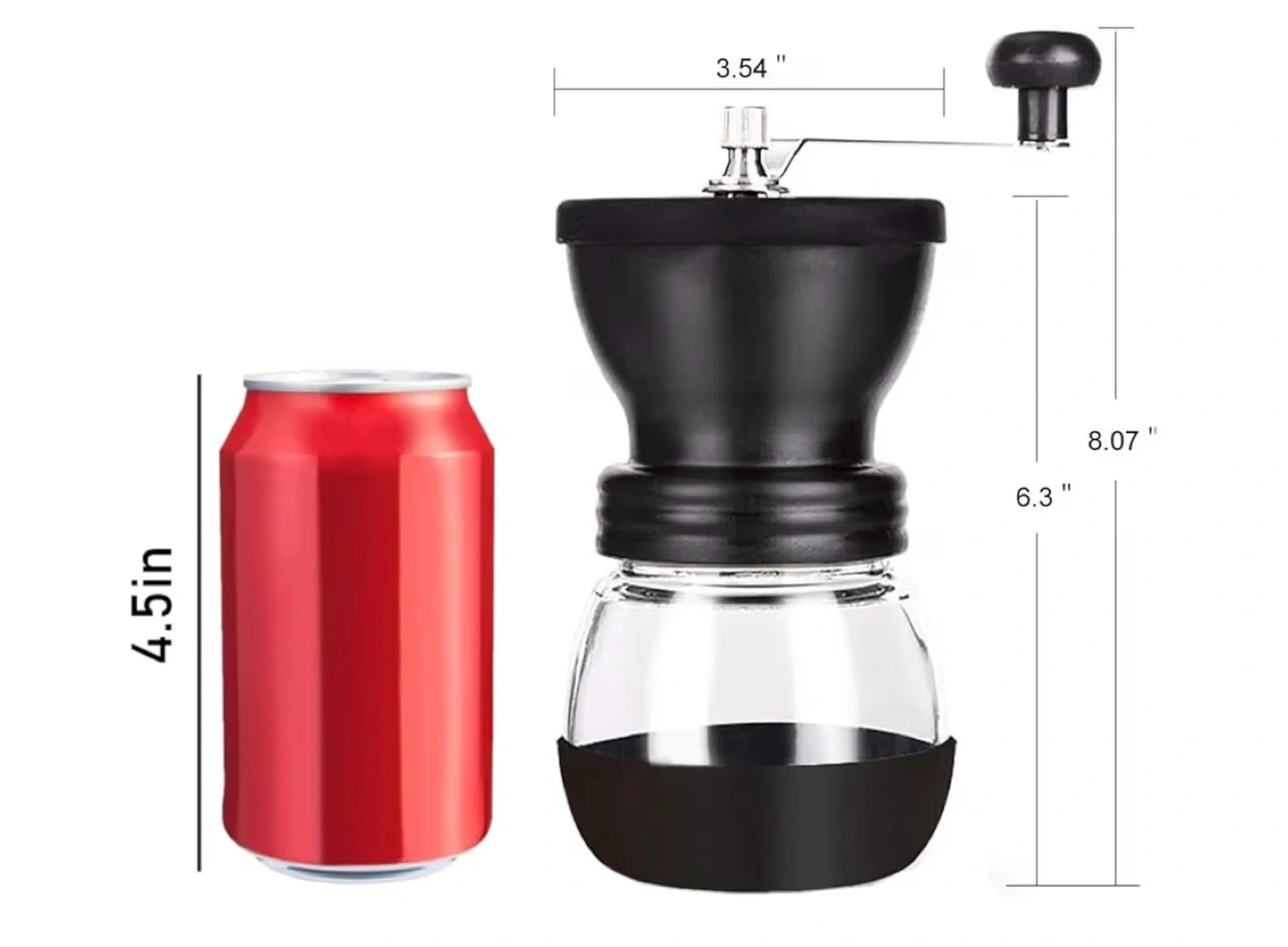 Selling a manual coffee bean grinder with a glass base and silicone grip.