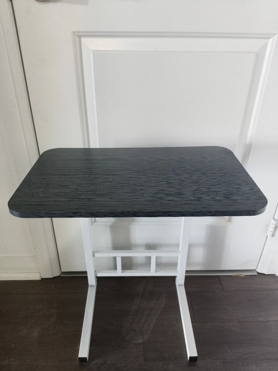 This black wood-look side table features a white metal frame and adjustable height. It's handy for use as a laptop stand or for snacks. Sturdy and easy to move around your space!