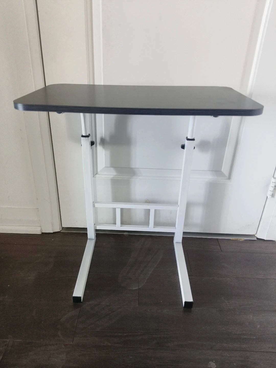 This black wood-look side table features a white metal frame and adjustable height. It's handy for use as a laptop stand or for snacks. Sturdy and easy to move around your space!