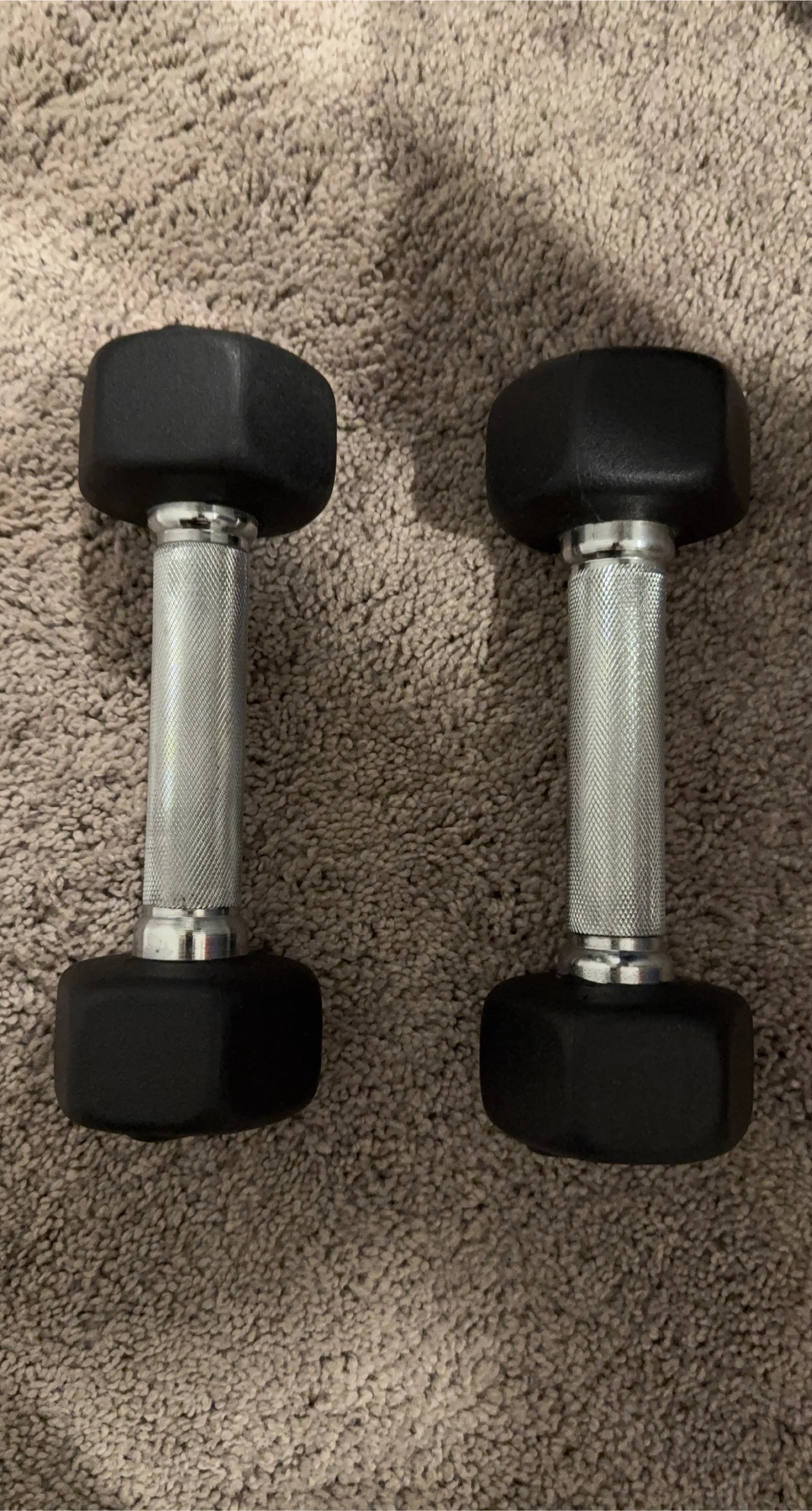 Two black hex dumbbells with chrome handles. These are great for weight training. They feature a knurled grip for secure handling.