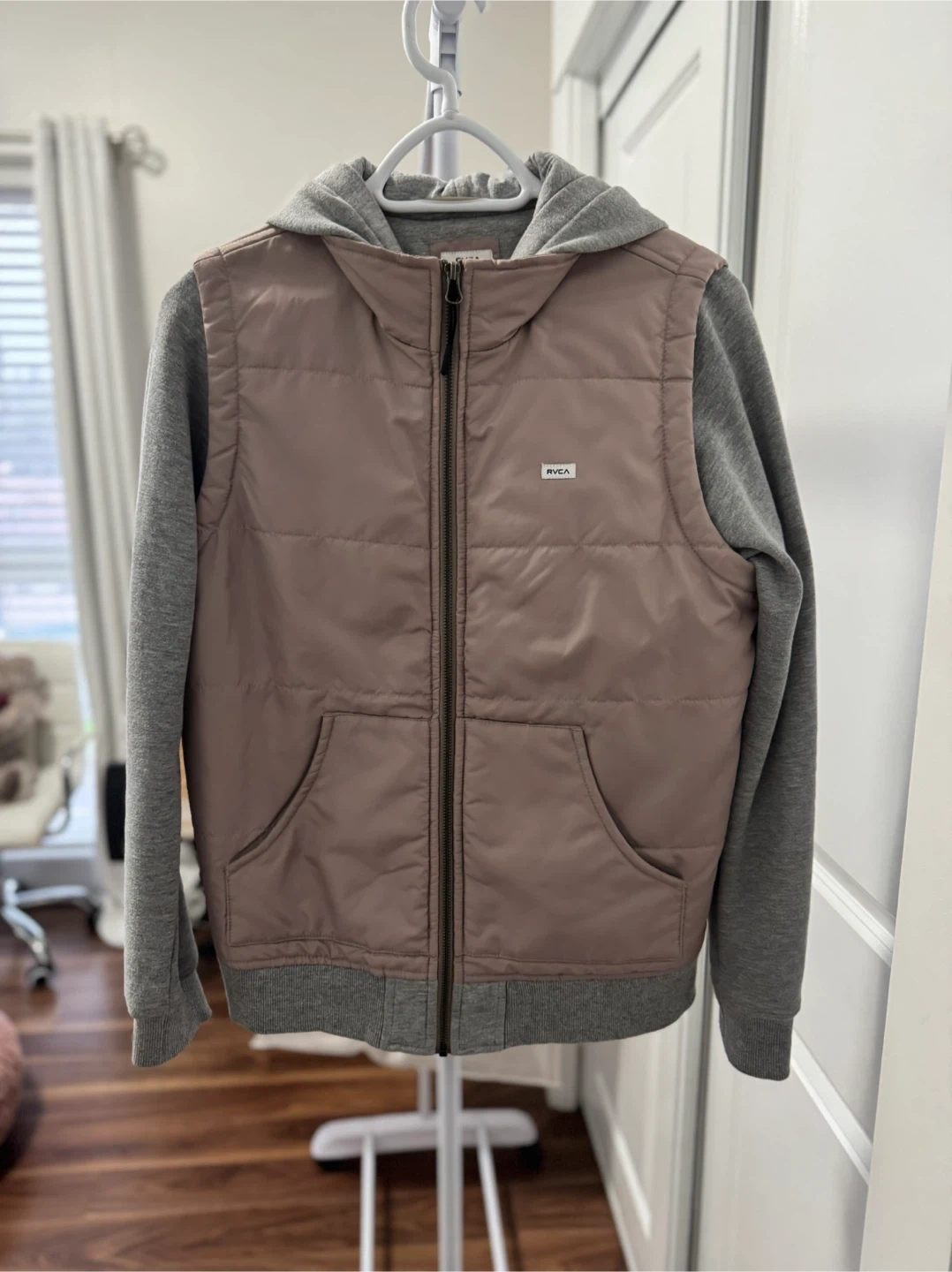 RVCA vest hoodie in size small. It's a stylish and comfortable piece, perfect for layering! The vest is a mauve/pink colour with grey sleeves and hood. Great for adding a bit of warmth and style to your outfit.