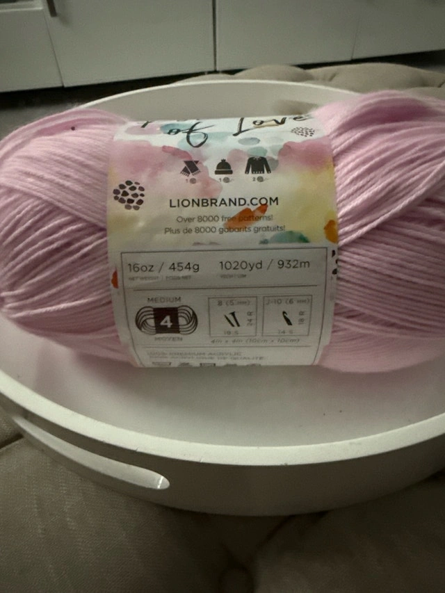 Add a pop of pretty in pink to your creations with this skein of Lion Brand Pound of Love yarn! This is a new skein. It is a lovely light pink colour, perfect for baby blankets or any soft project. * 100% premium acrylic * Medium Weight #4 * 16 oz/454 g * 1020 yds/932 m. If the ad is up, the item is available!