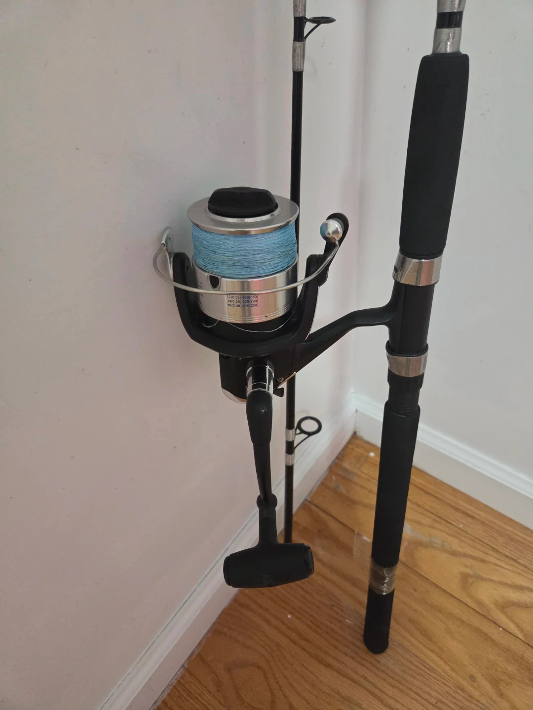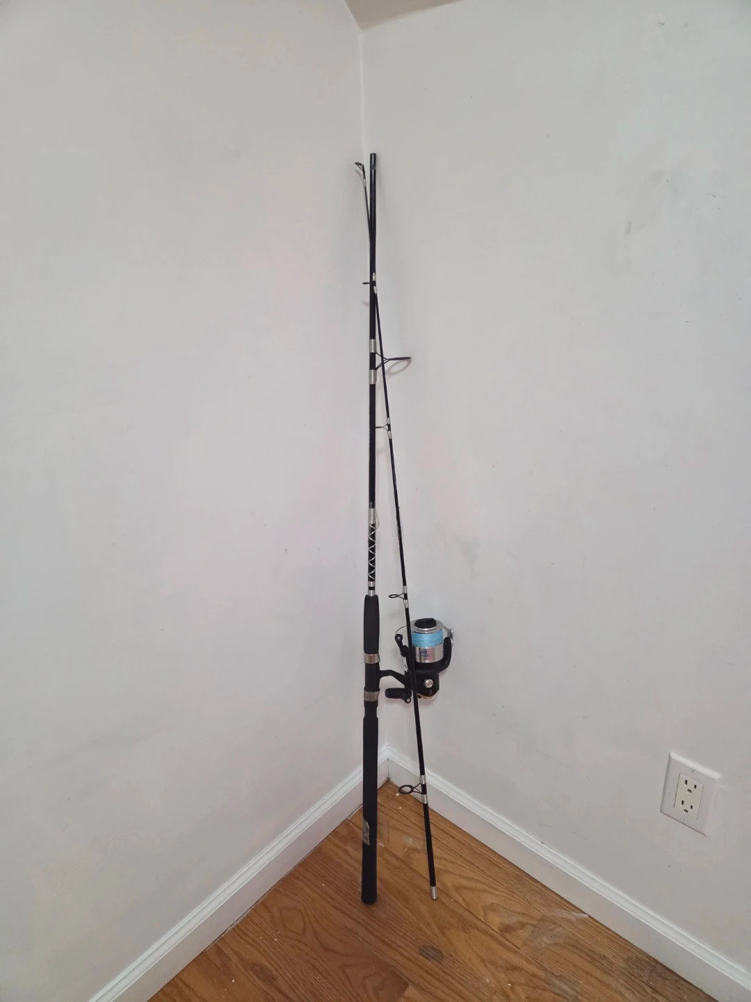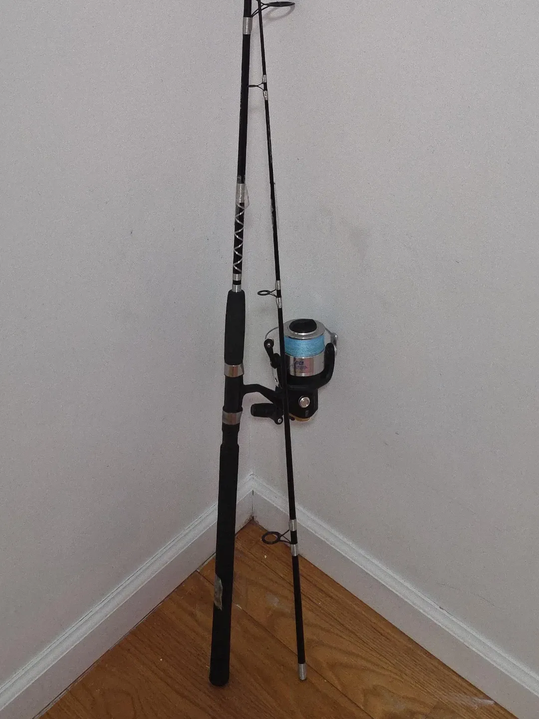 Fishing rod and reel combo. Comes with blue fishing line on the reel. It's ready for your next fishing trip!