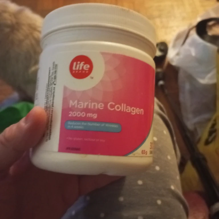 Life Brand Marine Collagen powder. Contains 2000 mg per serving. No gluten, lactose, or soy. Expiry date is June 2025. Bottle contains 63g.