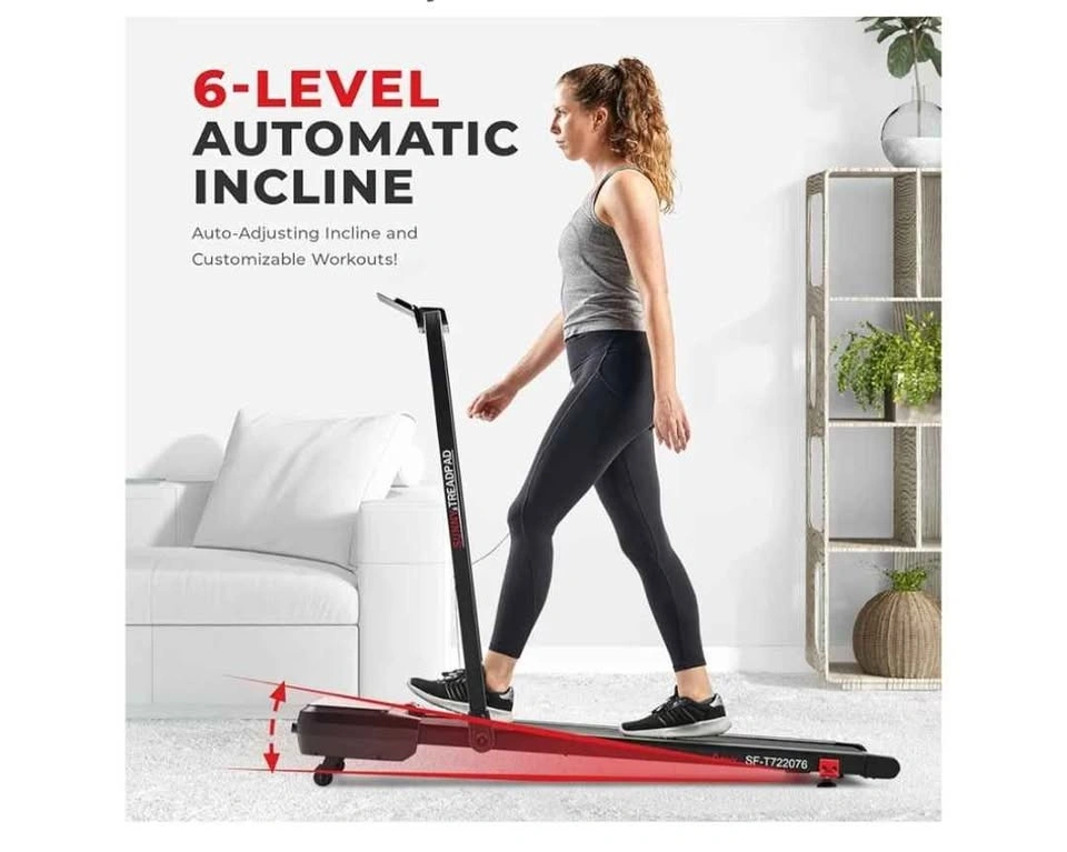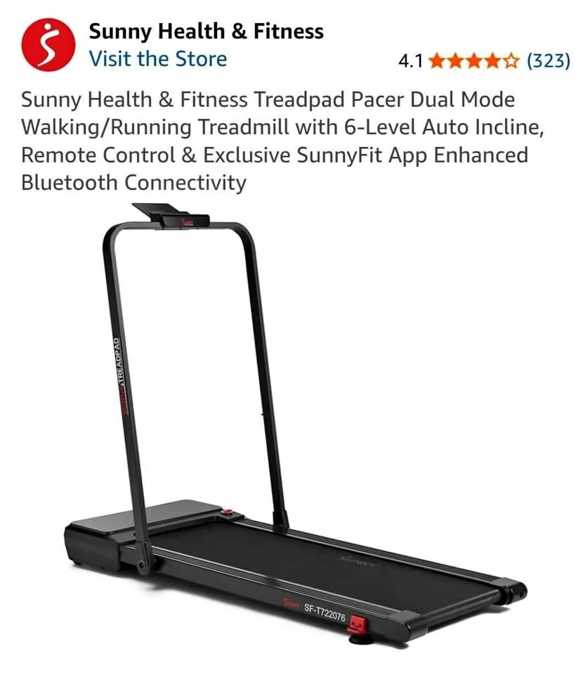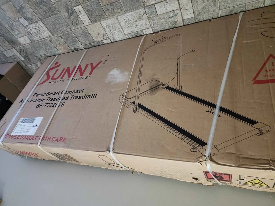 Brand new in box. Treadpad pacer dual mode walking/running treadmill. Has 6 level auto incline, remote control, exclusive SunnyFit app & Bluetooth. Use with or without handles. Easily slides under a desk, or lets you run up to 9.66 km/hr (6 mph).