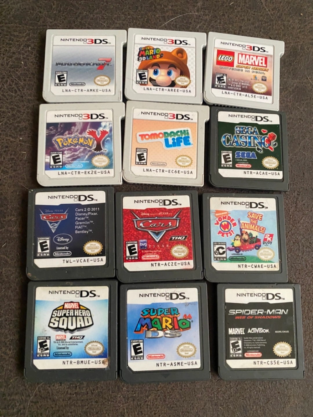 Collection of 12 pre-owned Nintendo DS and 3DS game cartridges. Titles include Mario, Pokemon, Cars, and more. Various genres and ratings.