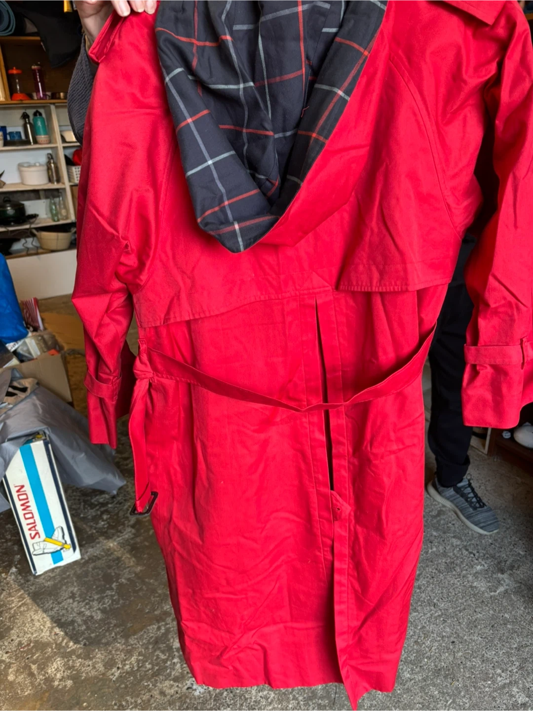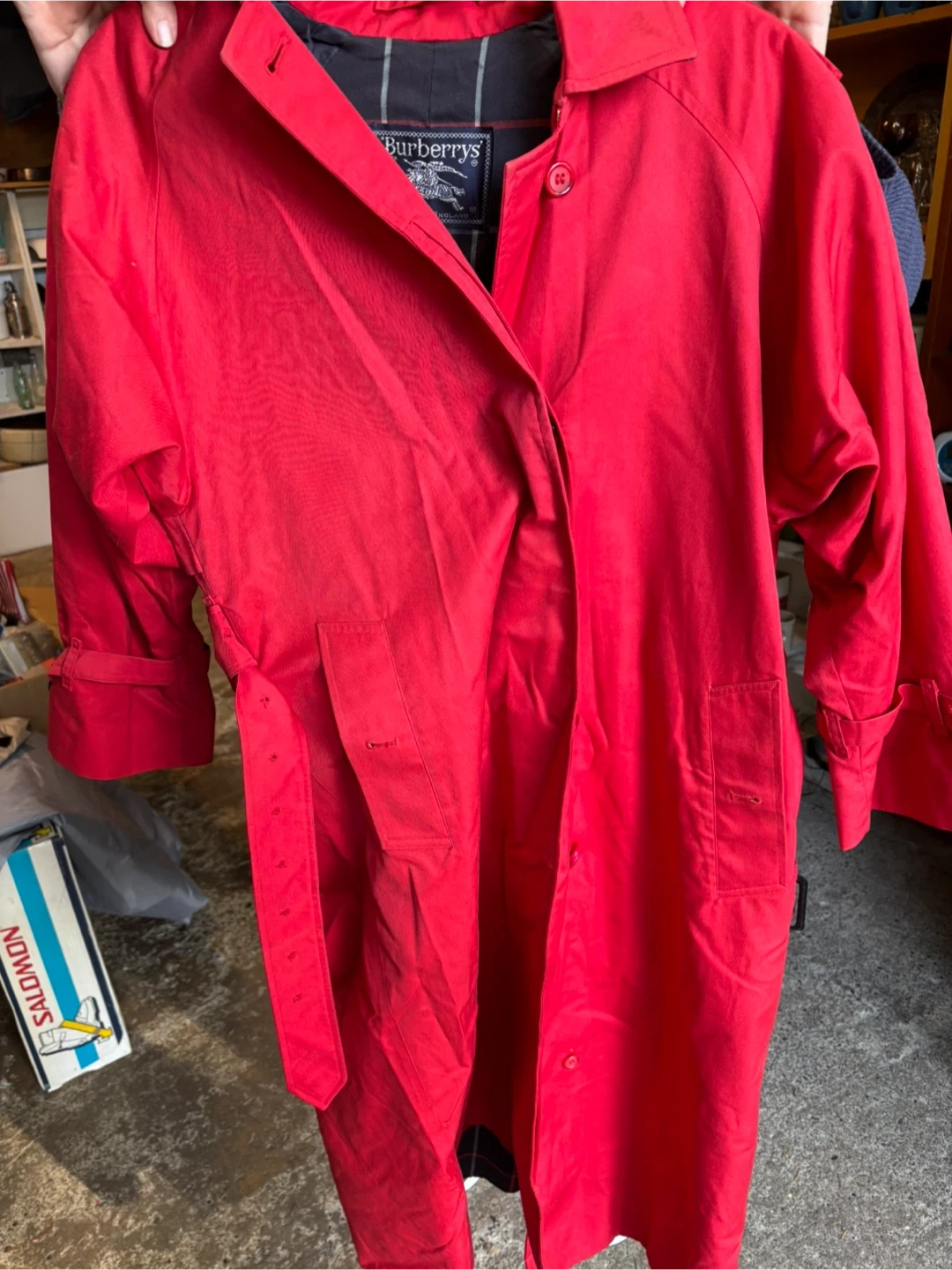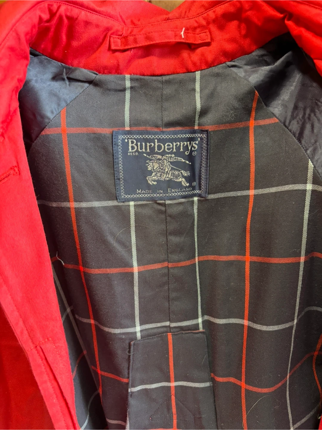 Classic Burberrys trench coat in vibrant red. Features the iconic Nova Check lining. Made in England. Cotton/polyester blend.