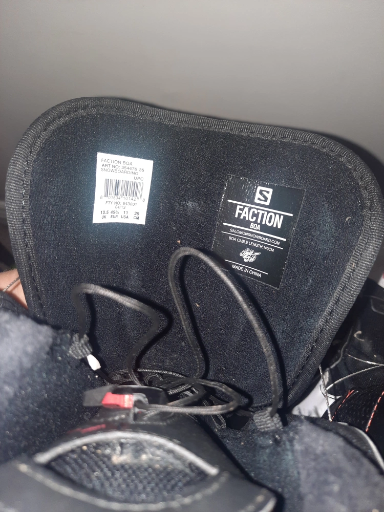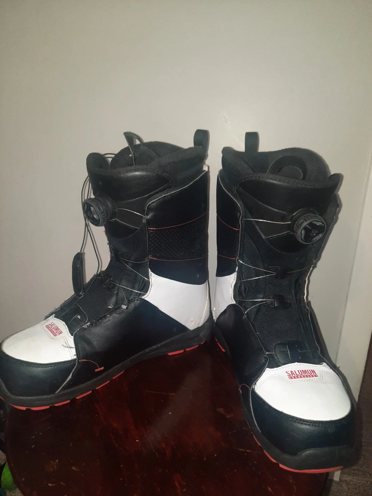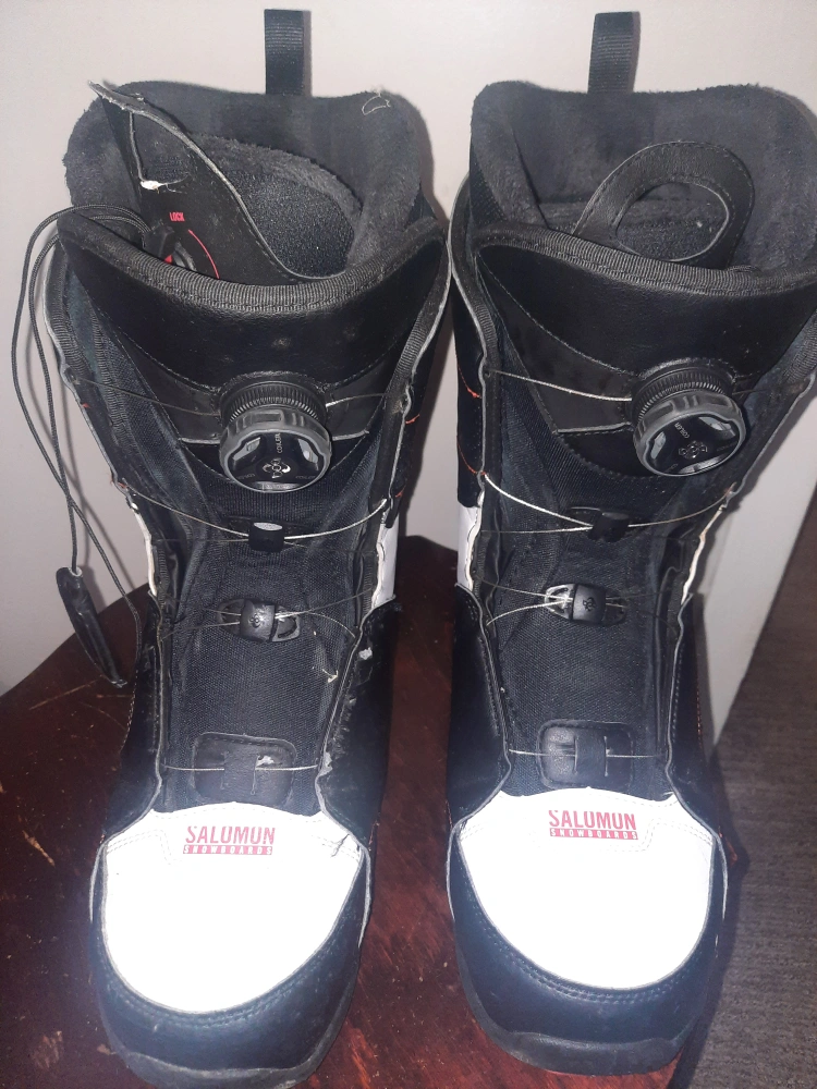 Used Salomon Faction Boa snowboard boots. Black and white colour scheme. Boa closure system. Good condition, minor wear.