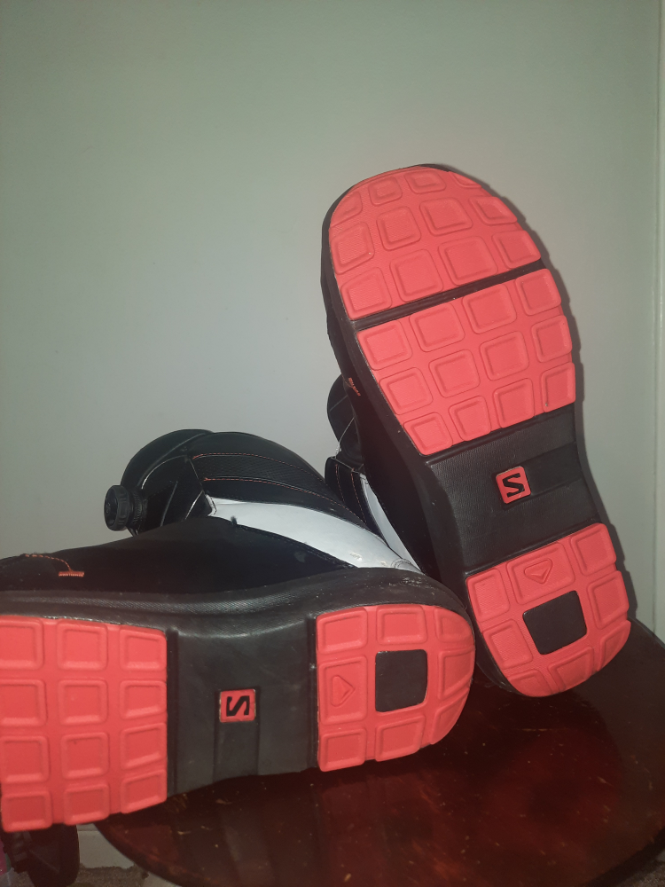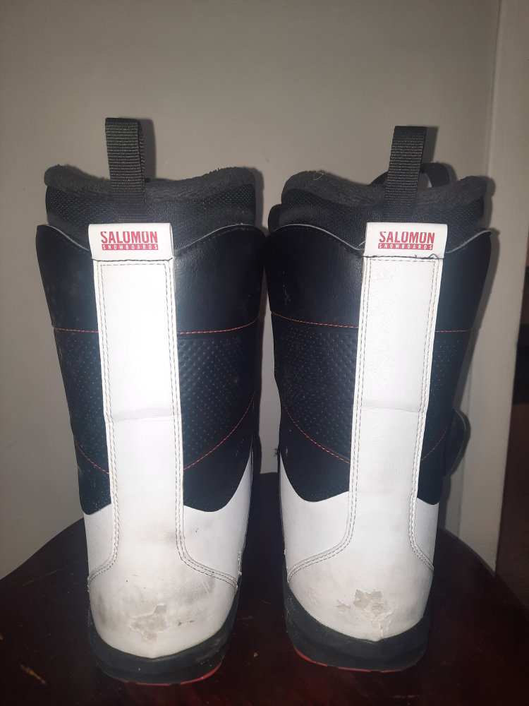 Used Salomon Faction Boa snowboard boots. Black and white colour scheme. Boa closure system. Good condition, minor wear.