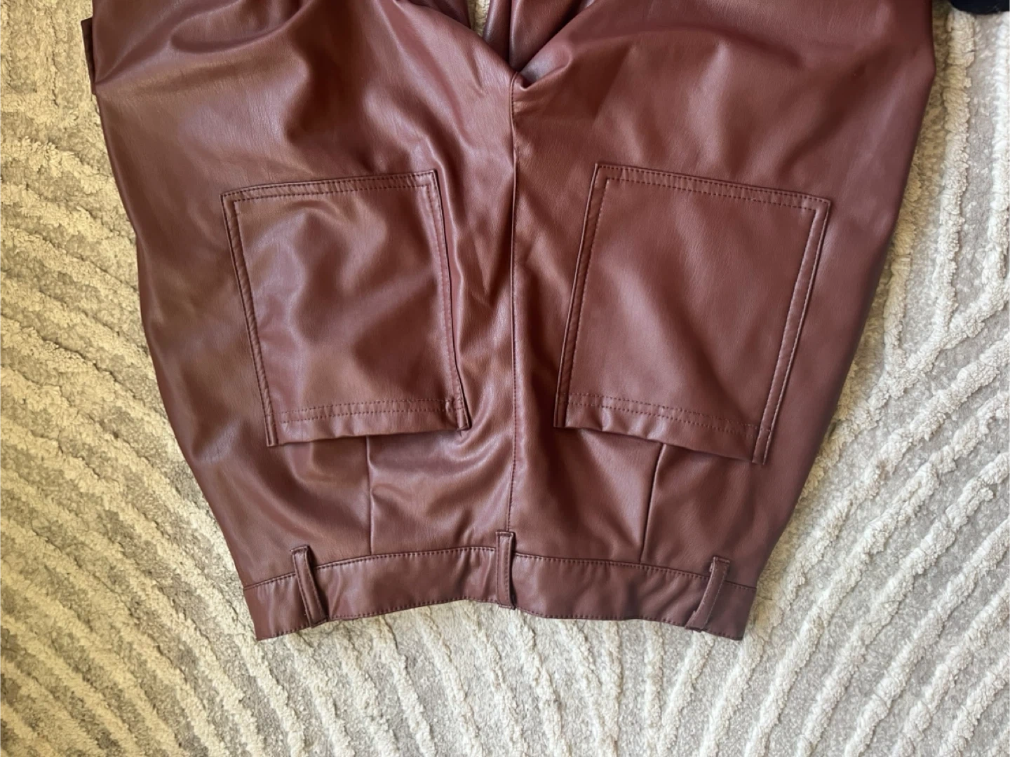 These faux leather cargo pants come in a stylish brown colour. They feature multiple pockets and elasticated cuffs. A great choice for adding an edgy look to any outfit!