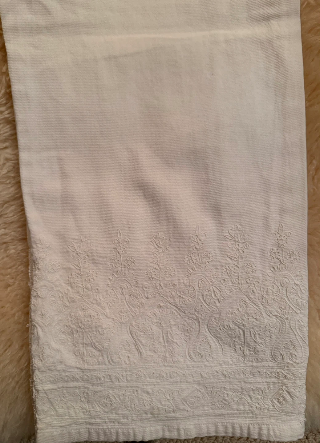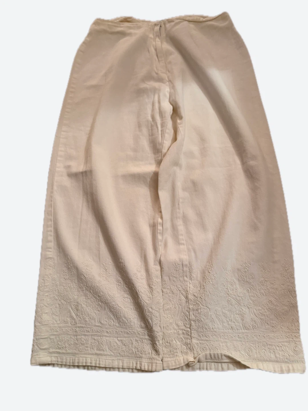 White capri pants with ornate embroidery on the hem. 100% Cotton material. Waist 72.