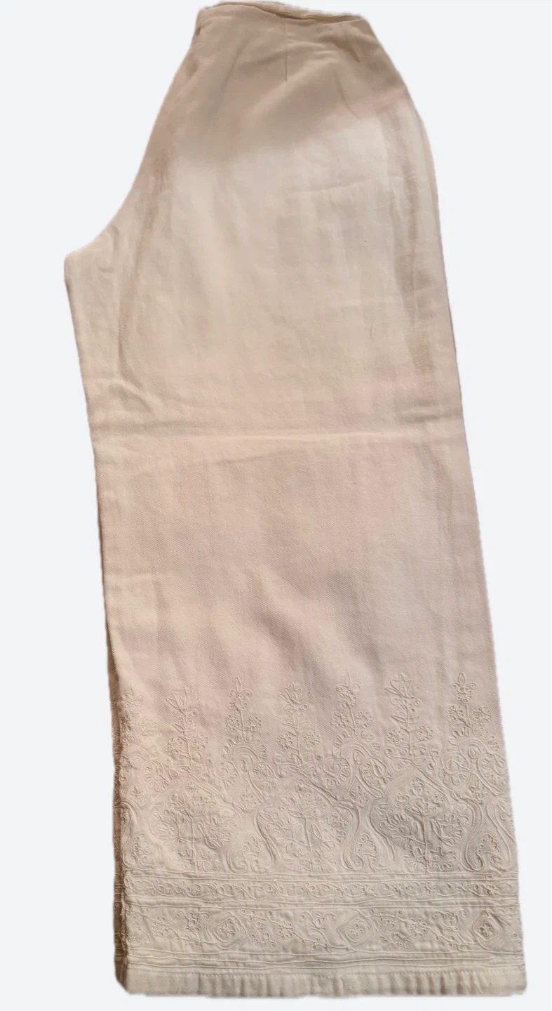 White capri pants with ornate embroidery on the hem. 100% Cotton material. Waist 72.