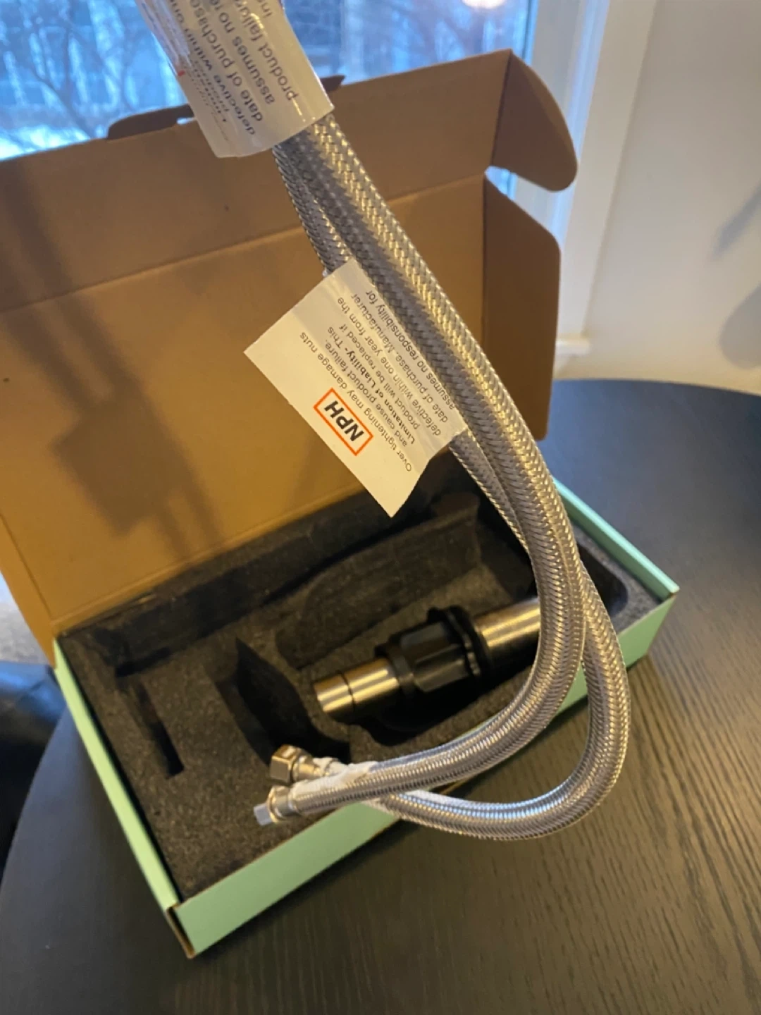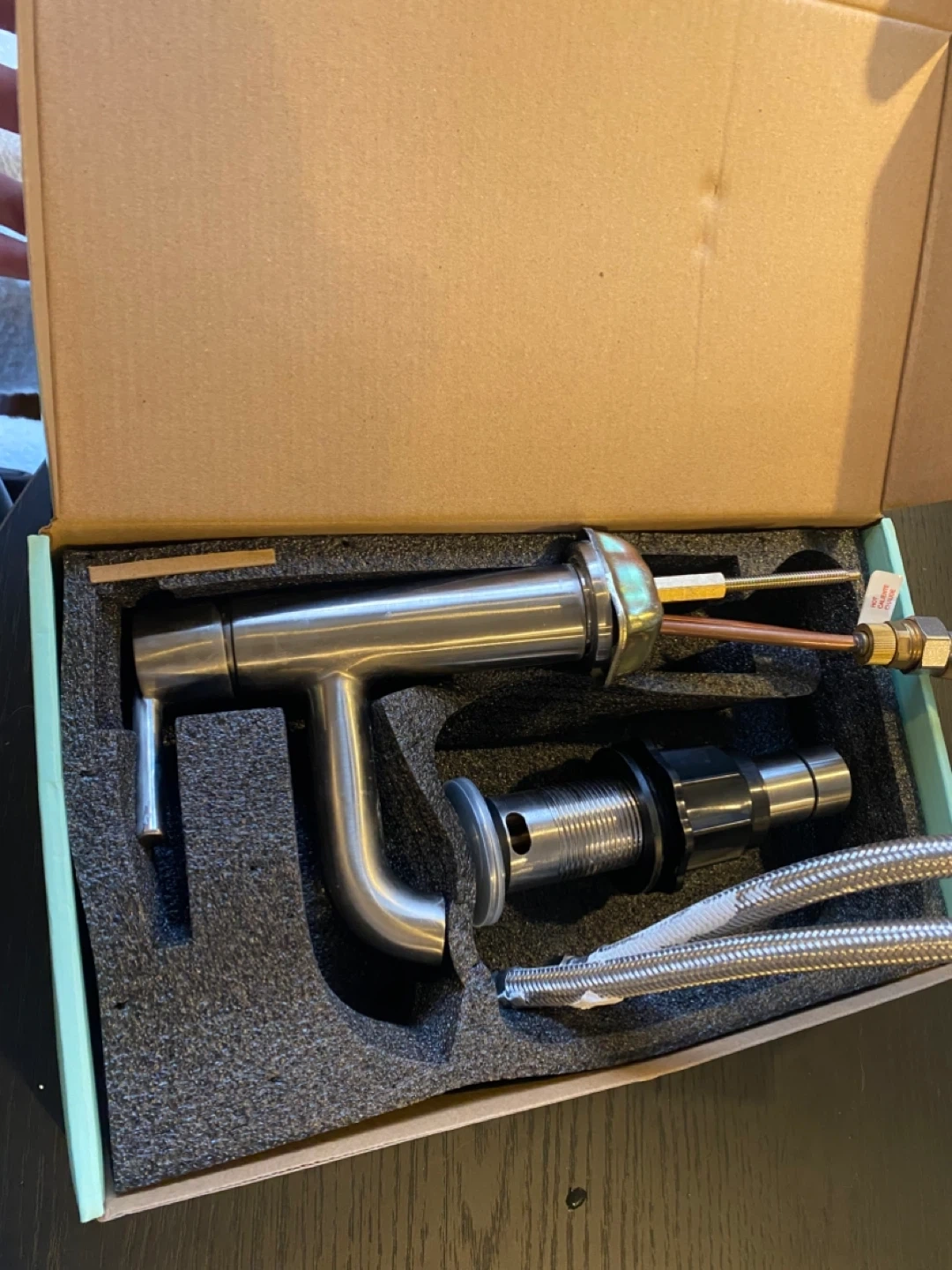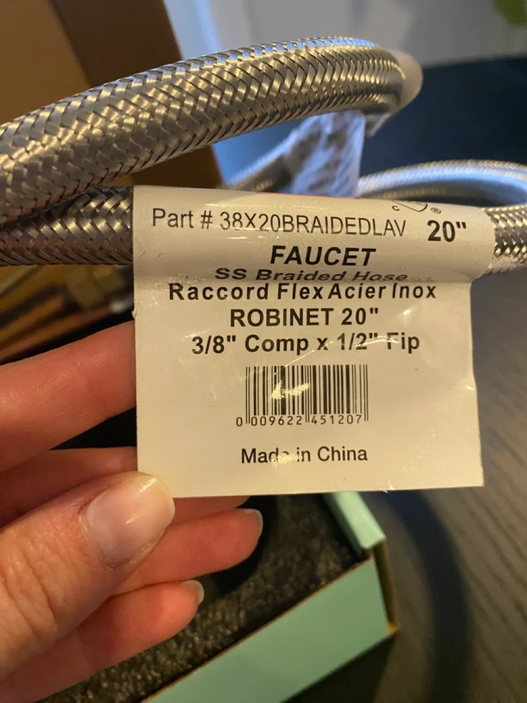 This is a new satin nickel faucet with a stainless steel braided hose. It's 20 inches long and has a 3/8" compression connection. Includes drain assembly with seal still on. Great for a bathroom sink upgrade! See last photo for some discolouration on the faucet handle.