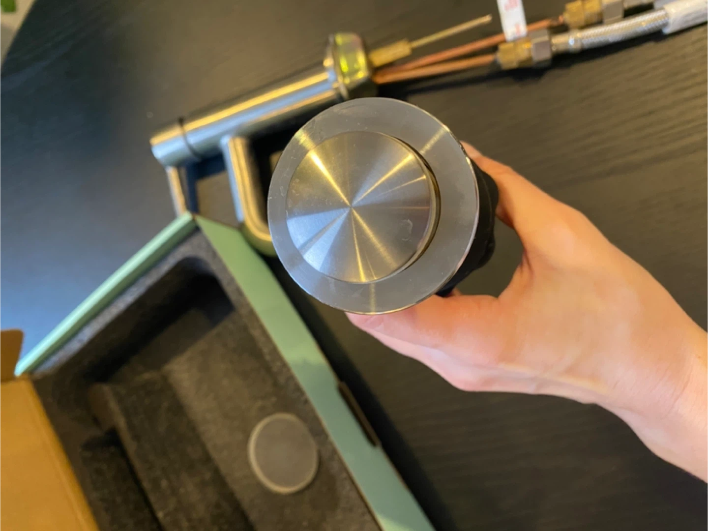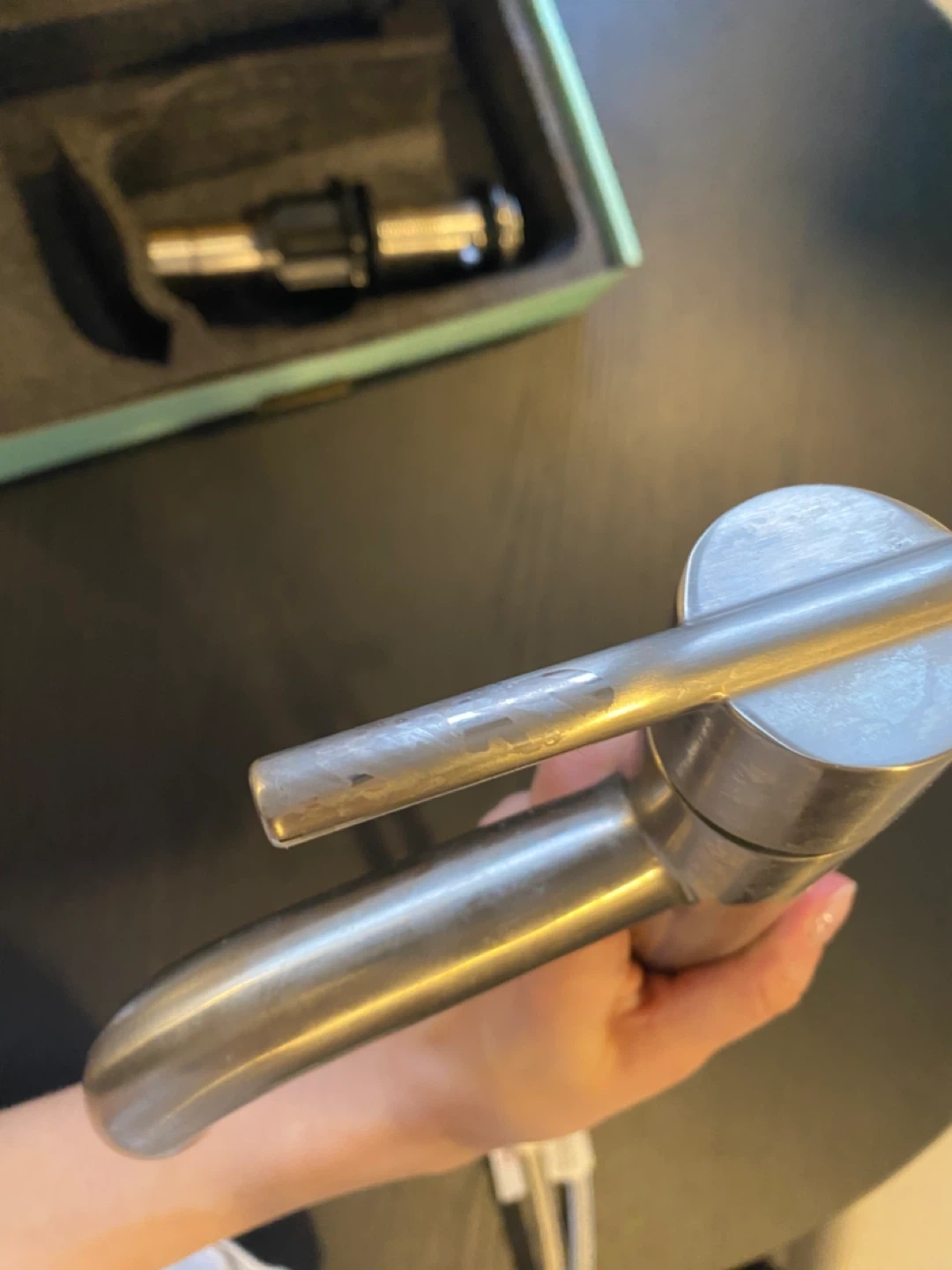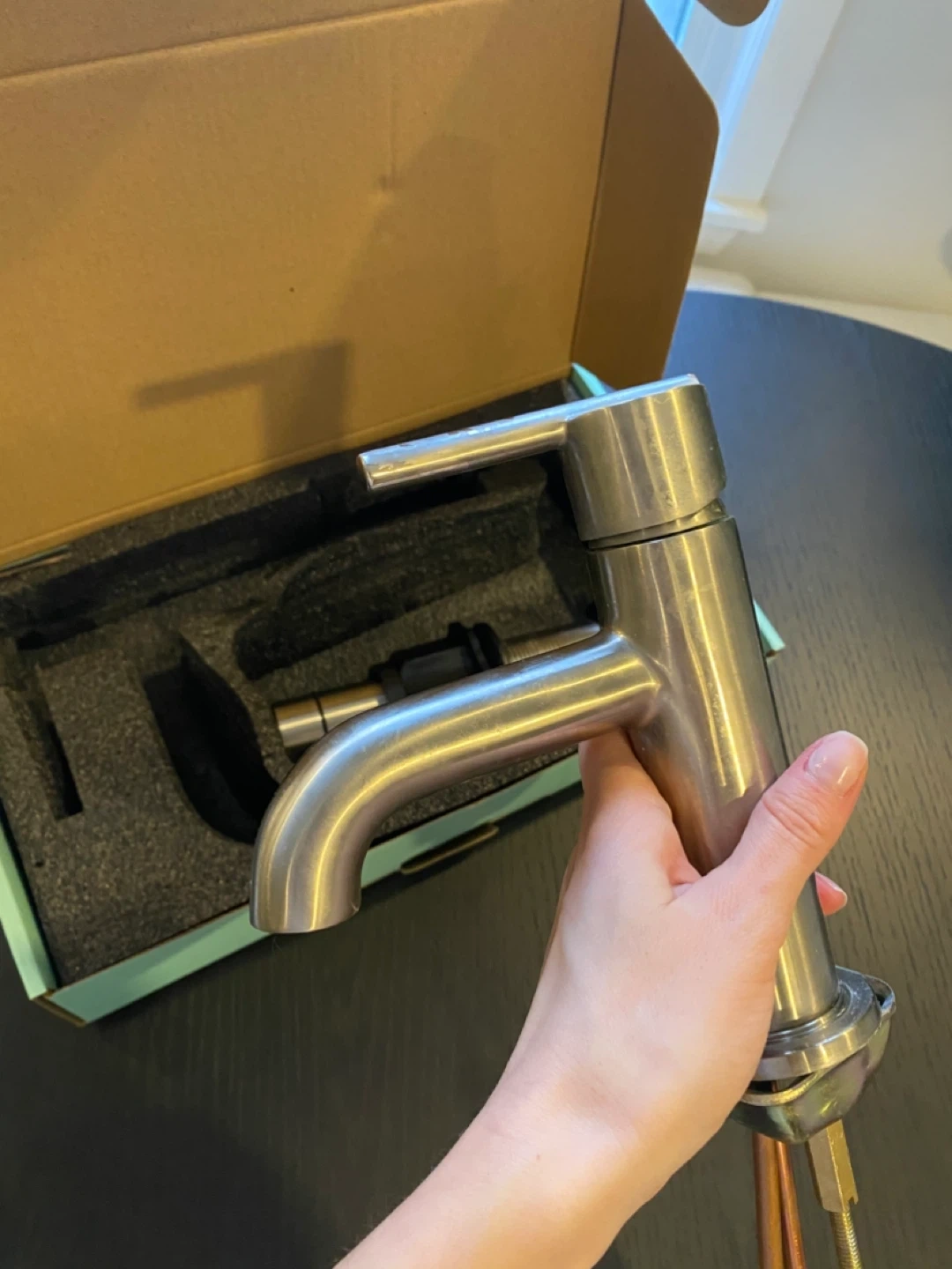 This is a new satin nickel faucet with a stainless steel braided hose. It's 20 inches long and has a 3/8" compression connection. Includes drain assembly with seal still on. Great for a bathroom sink upgrade! See last photo for some discolouration on the faucet handle.