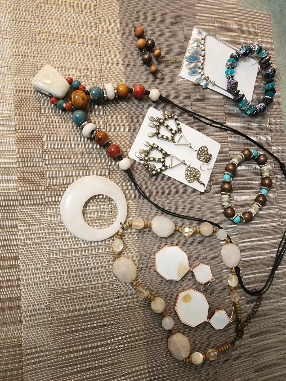 This set includes a long beaded necklace with a large white pendant and a matching pair of earrings. It also comes with a second beaded necklace and two bracelets. Perfect for adding a touch of boho flair to any outfit!