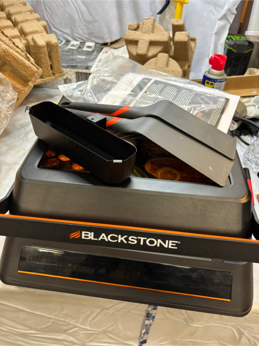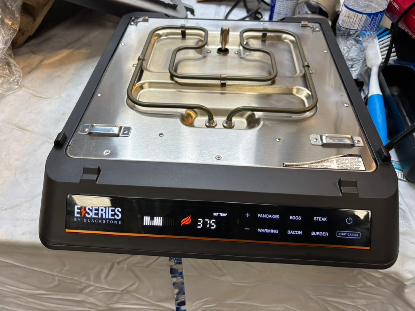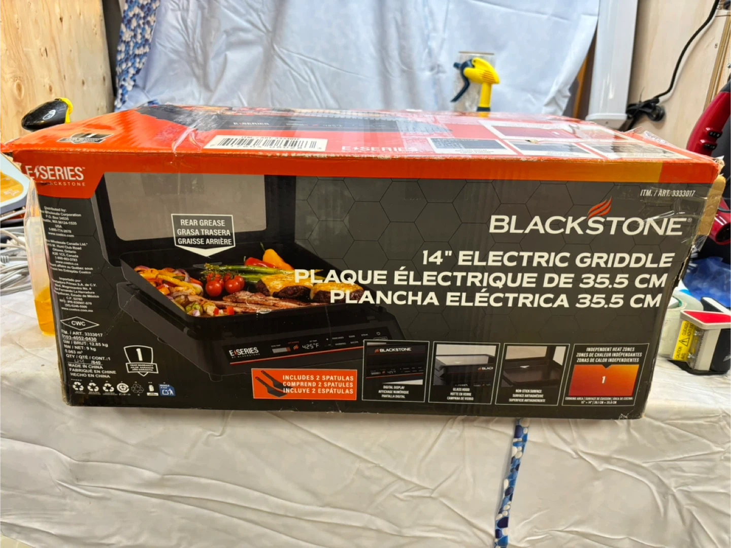 This Blackstone E-Series electric griddle is 14 inches wide. It includes the grease trap and two spatulas. Features independent heat zones for versatile cooking!