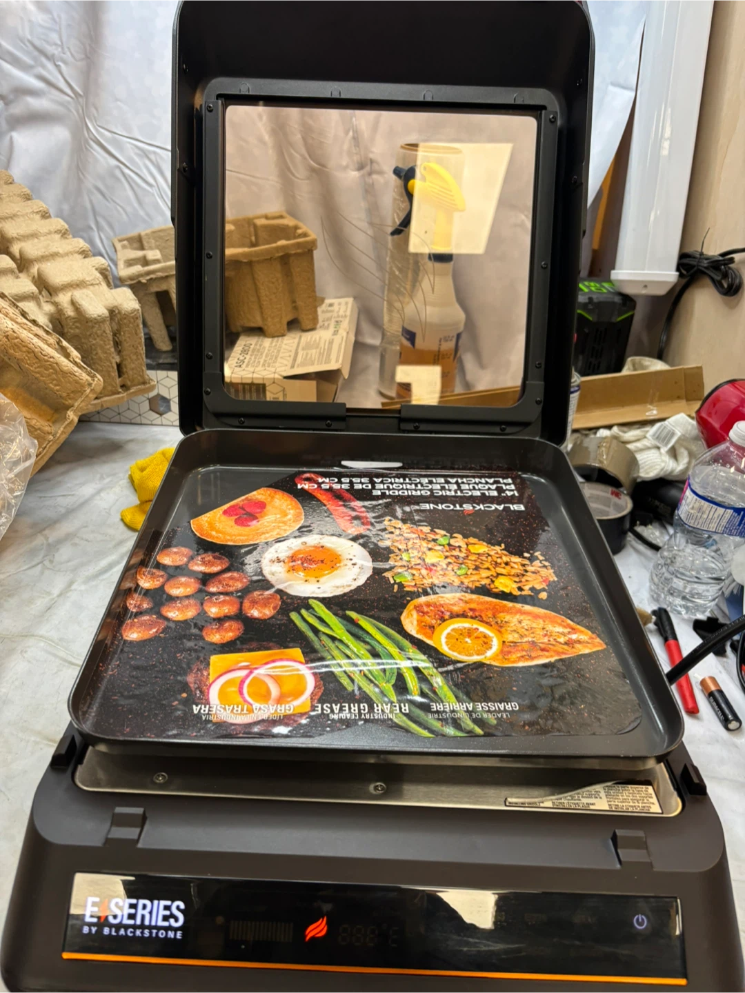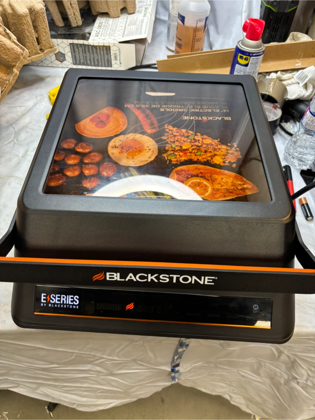 This Blackstone E-Series electric griddle is 14 inches wide. It includes the grease trap and two spatulas. Features independent heat zones for versatile cooking!