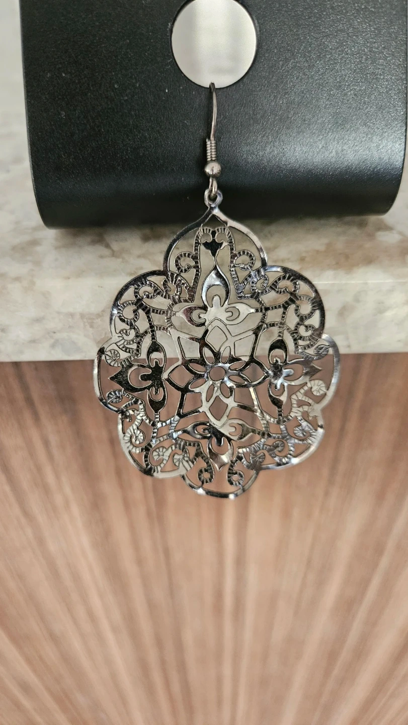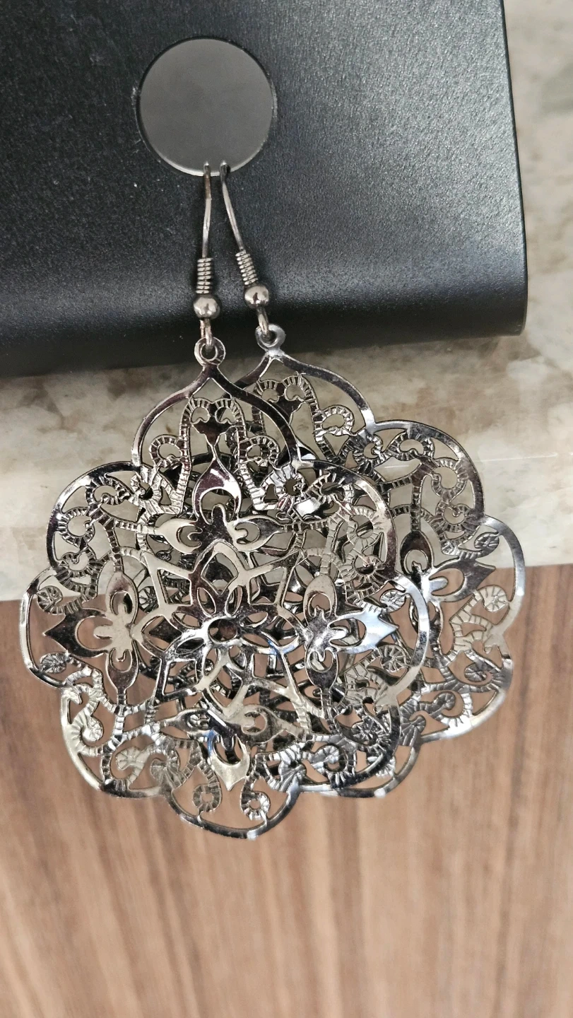Selling a pair of silver-tone floral dangle earrings. They have a beautiful filigree design and are brand new, never used. Perfect for a gift or adding a touch of elegance to any outfit!