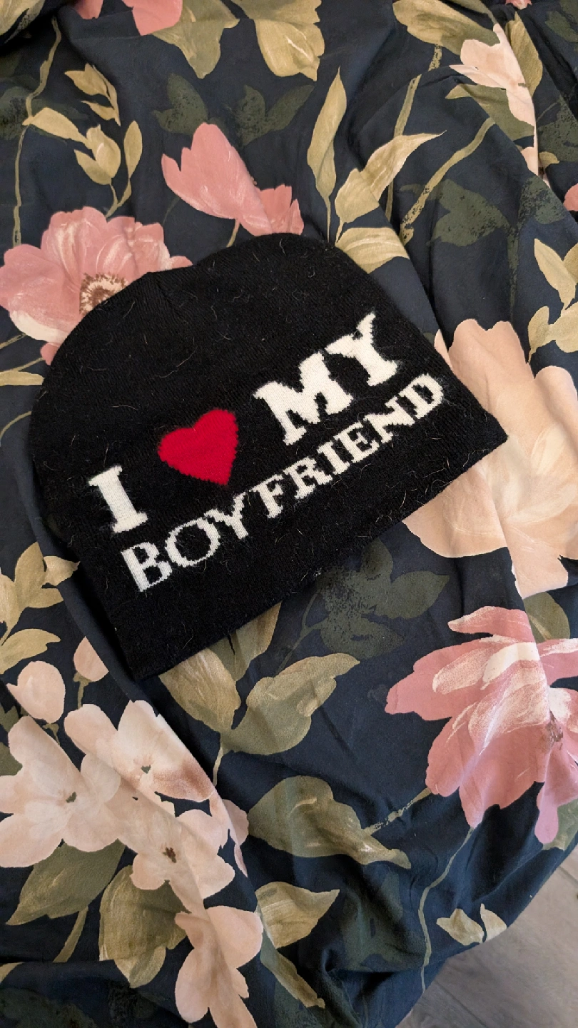 Selling a black beanie with the text "I ❤️ My Boyfriend" on the front. It's in great condition and perfect for keeping warm!
