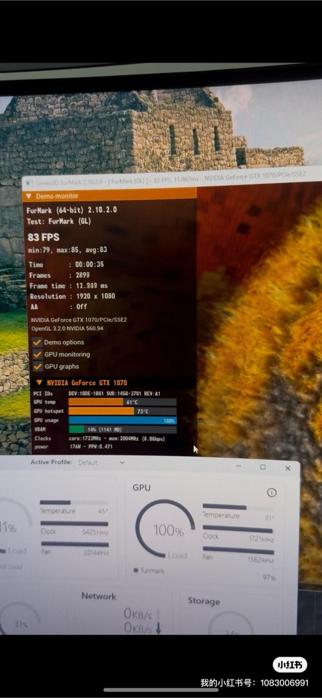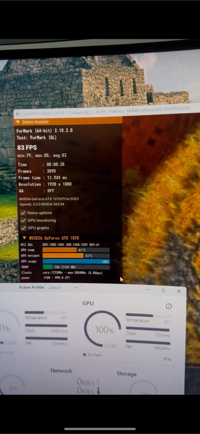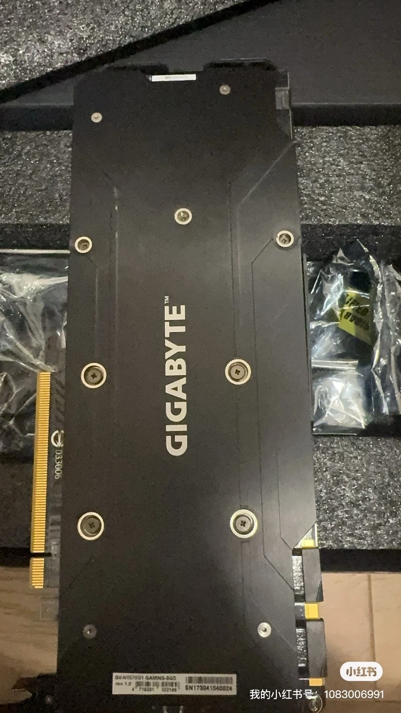 This is a GIGABYTE GeForce GTX 1070 graphics card with 8GB of GDDR5 memory. It features three fans for cooling and is a Gaming OC model. The card is in good working order, tested with FurMark.