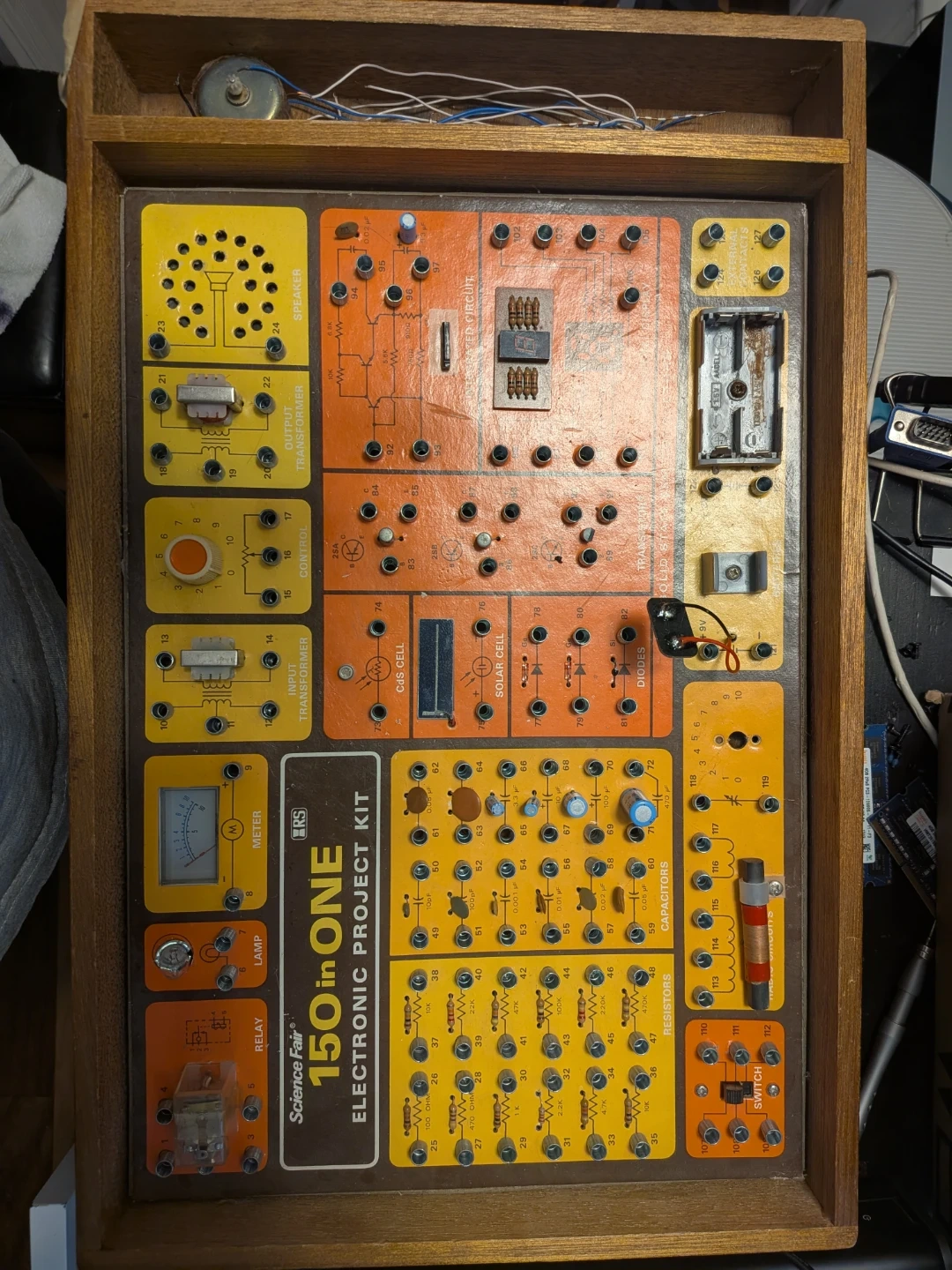 Helping my dad clear out his storage. This is an old RadioShack product to teach the basics of electronic circuits and components. Would be great for collectors and kids.