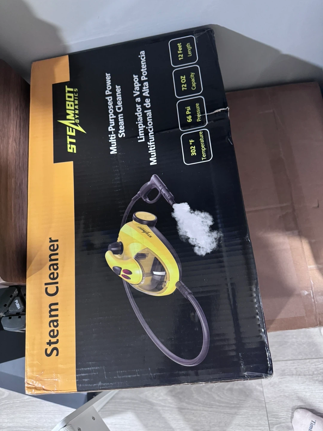 Selling a brand new Steambot Dynamics Multi-Purpose Power Steam Cleaner! It has a 72 OZ capacity and a 12 feet length. It can reach a temperature of 302°F with 66 PSI pressure. Box included