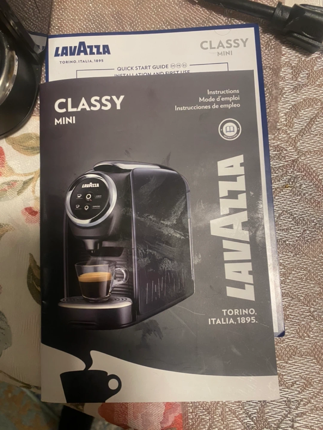 This Lavazza Classy Mini is a compact espresso machine. It's designed for making espresso and lungo coffee drinks. A quick start guide is included.