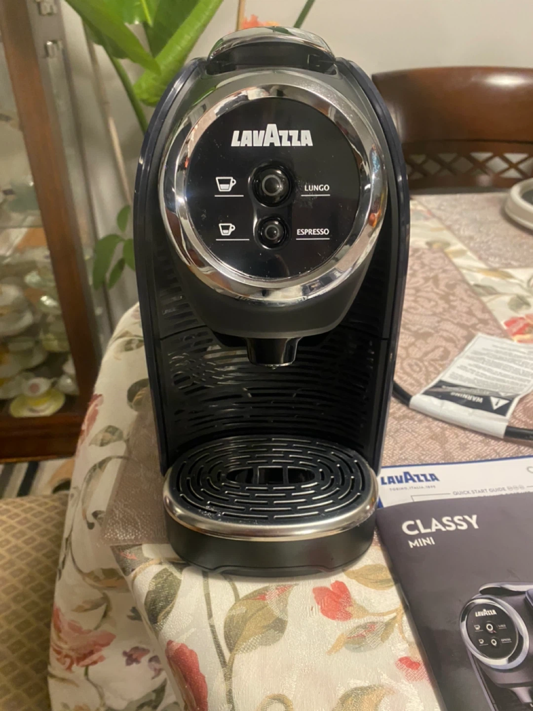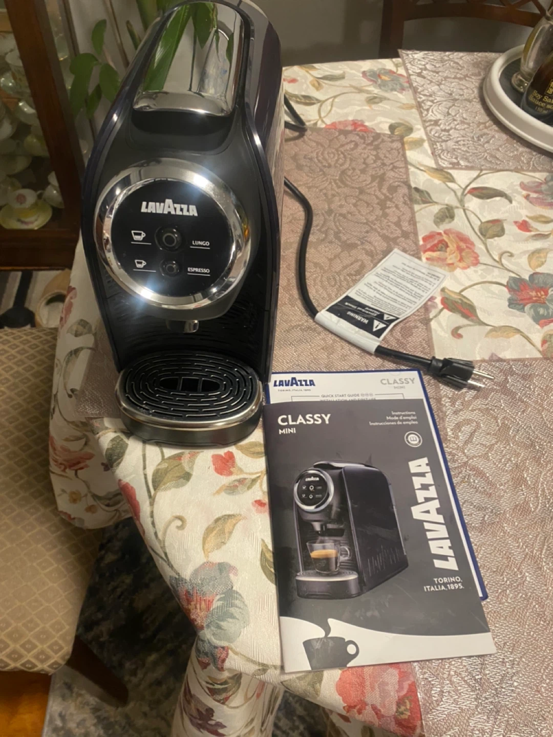 This Lavazza Classy Mini is a compact espresso machine. It's designed for making espresso and lungo coffee drinks. A quick start guide is included.