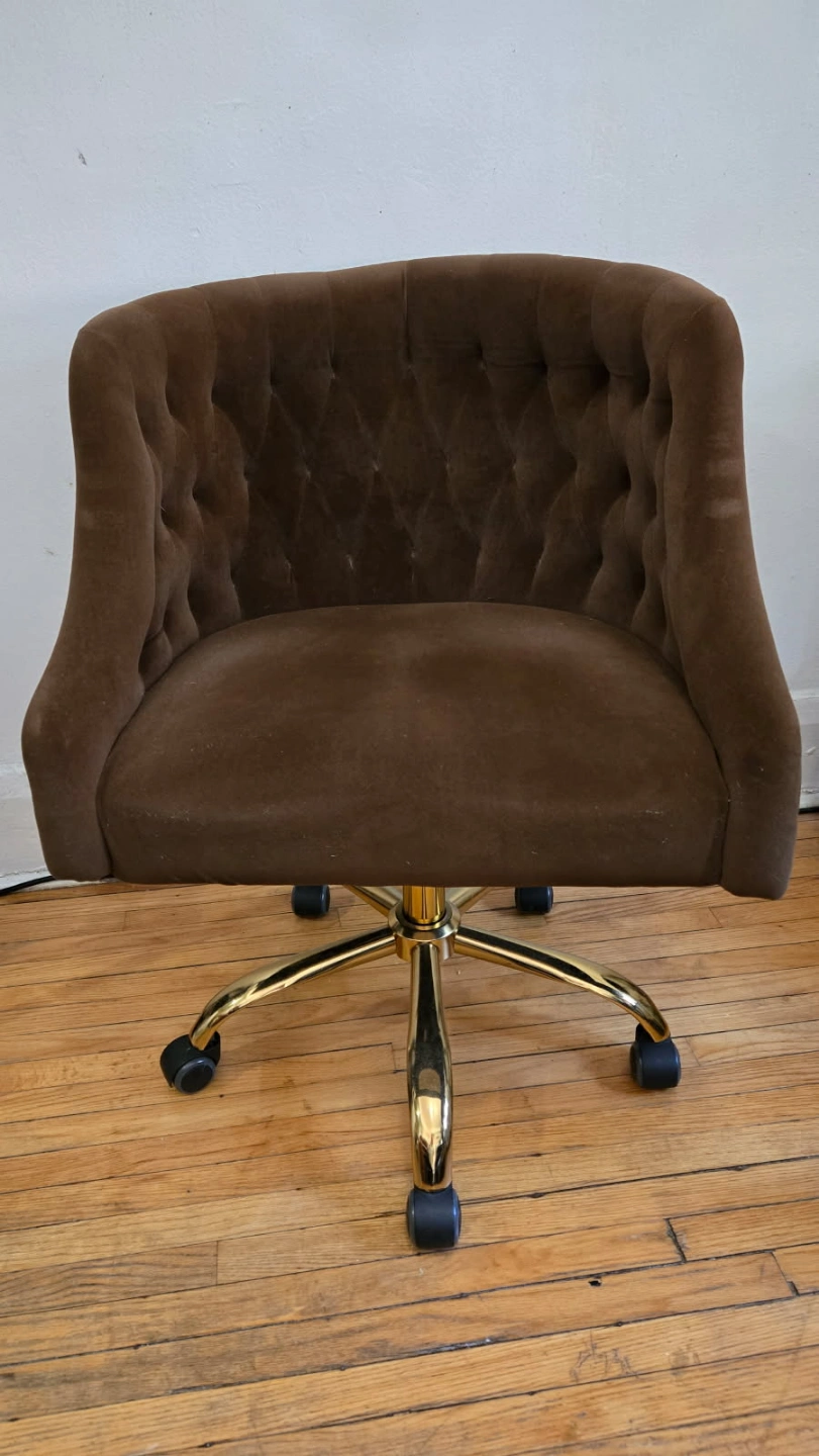 I have 2 identical brown tufted velvet office chairs. Gold-toned metal base and rolling casters. Suitable for office or home use.
